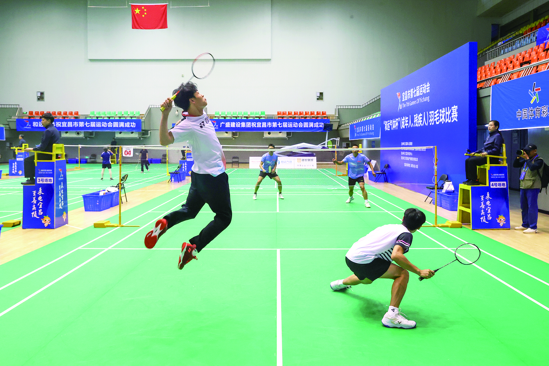 10月13日,宜昌市体育中心体育馆,运动员正在参加羽毛球男子双打比赛。连日来,宜昌市七运会各项比赛正在紧张进行中。