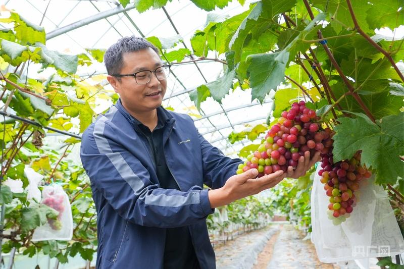 王先玉介绍村里种植的葡萄(央广网记者邓子依 摄)