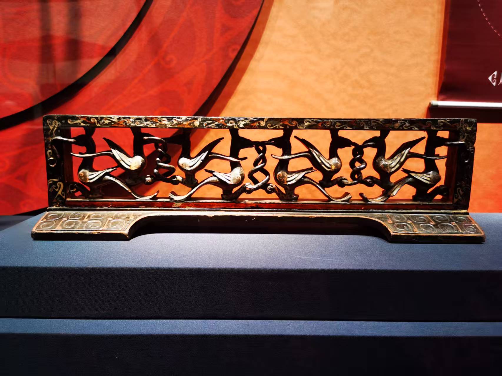 楚文化是先秦时期长江文化的代表,以红、黑为主色调的漆木器是楚文化的典型器物。此次展出的战国时期透雕凤鸟斗蛇瑟座为湖北荆州博物馆藏漆器精品,通体髹黑漆,并用红、黄二色彩绘花纹,雕工精细,凤鸟与蛇造型灵动、栩栩如生。精美的漆木器不仅展示了楚人的工艺水平,也体现了他们的精神信仰。凤鸟嘴衔蛇尾、爪握蛇头,颇具力量和动感,既表现了鸟蛇争斗的自然场景,也反映了楚人对凤鸟的尊崇。