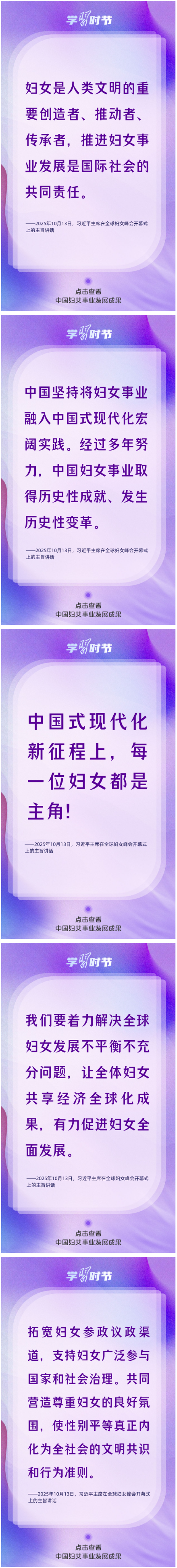 自1995年承办联合国第四次世界妇女大会后,我国坚定落实《北京宣言》《行动纲领》,始终是全球妇女事业重要参与者、推动者、引领者。进入新时代,我国妇女发展水平全方位跃升,为全球提供了中国样本。