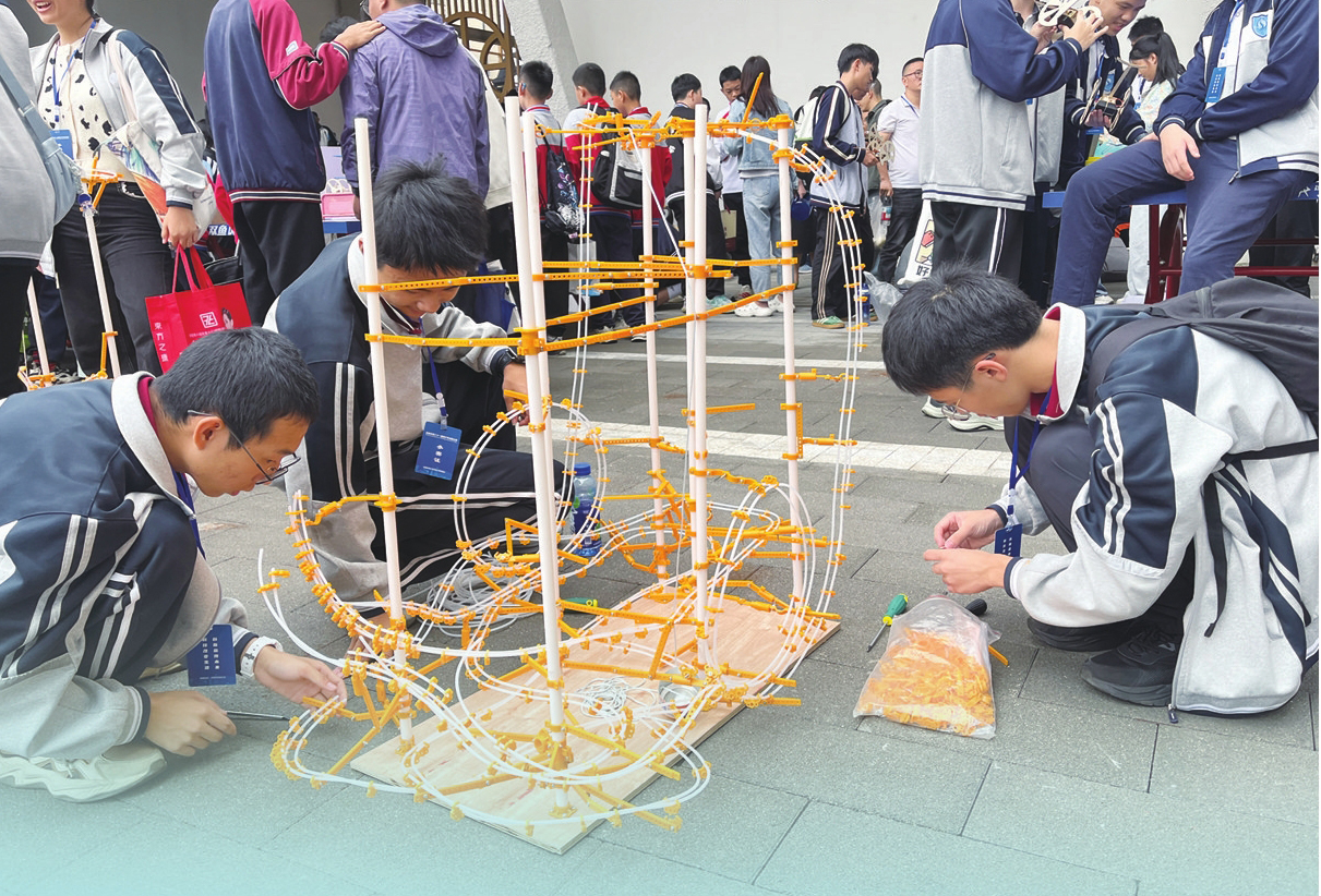 只见孩子们围在桌前,熟练地将一个个细小零件组装成能独立行走的机器娃娃。待调试完毕后,便操控着娃娃接力行走至中心区域赢取积分。每一步精准的移动,都伴随着现场的阵阵喝彩。