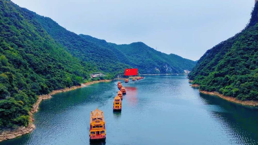 ● 在倒影峡水域上空,巨幅国旗迎风飘扬,与绿水青山交织成假期风景里最动人的画卷;