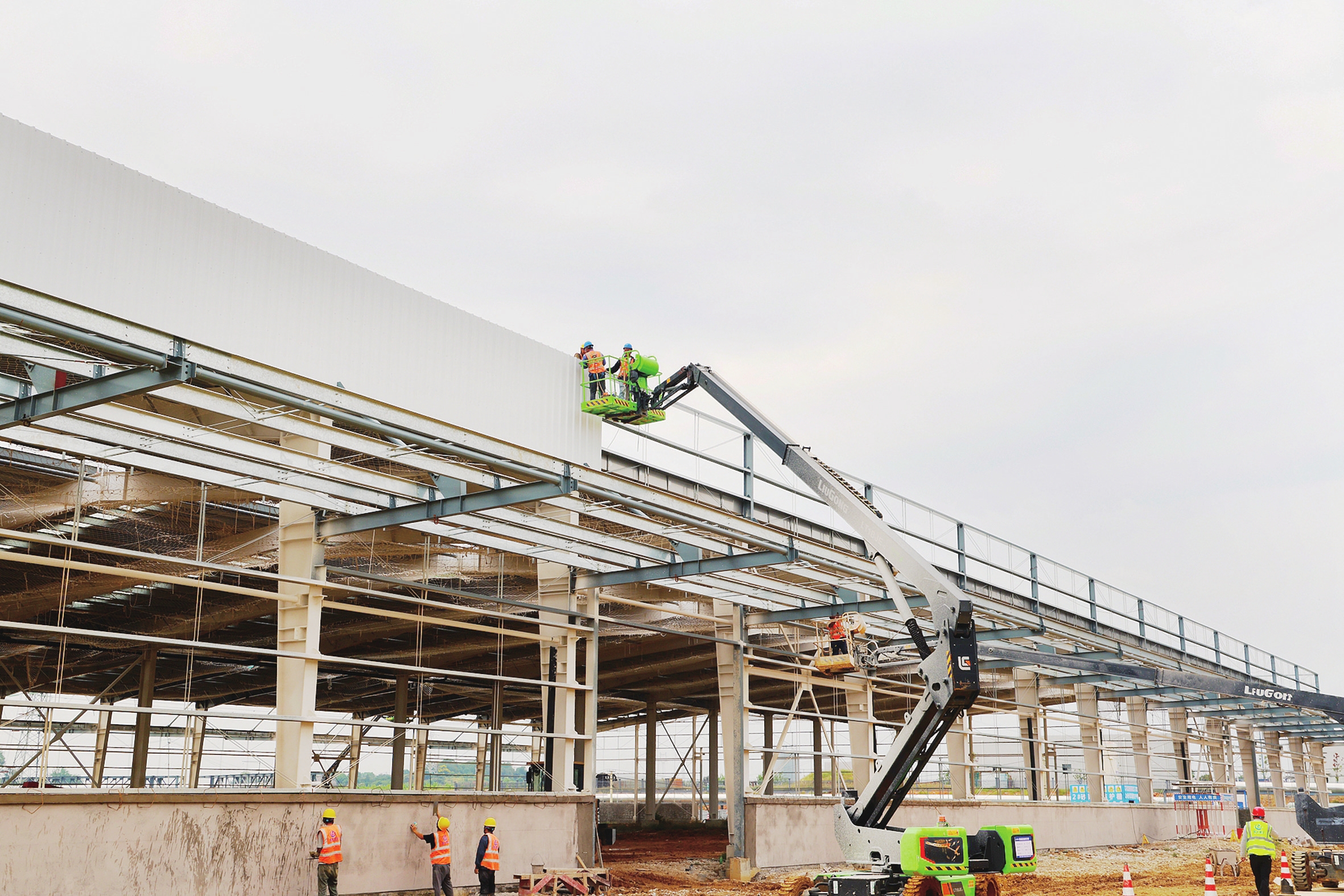 10月11日, 位于枝江市的姚家港化工园,建设者在一家总投资过50亿元企业建设现场,安装标准化厂房外墙,抢抓施工进度,助力企业早日投产达效。(记者黄翔 摄)