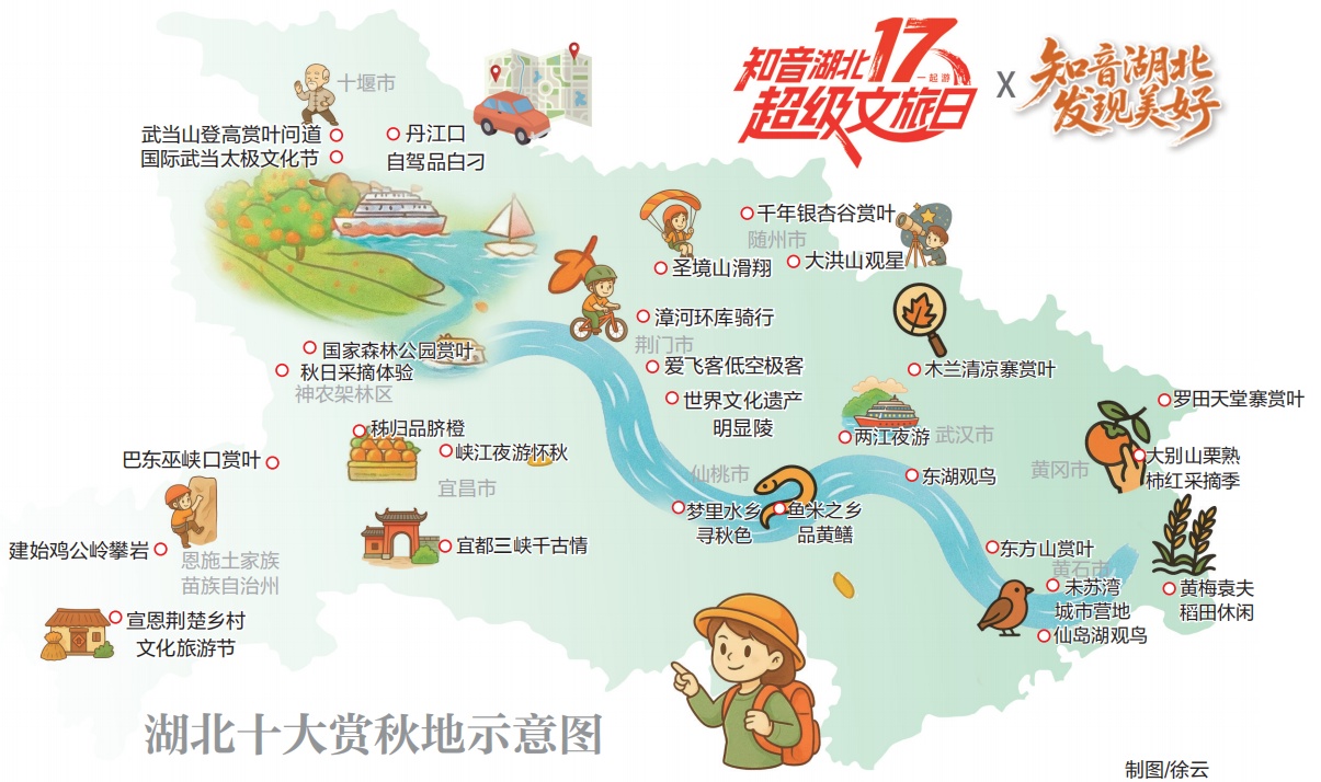 本次活动重磅发布的十大赏秋地,是经省文化和旅游厅与湖北日报传媒集团“发现美好”联合项目组推荐、精心筛选而来。十大目的地分别是:武汉(东湖观鸟、两江夜游、木兰清凉寨赏叶);黄石(东方山赏叶、未苏湾城市营地、仙岛湖观鸟);宜昌(峡江夜游怀秋、秭归品脐橙、宜都三峡千古情);十堰(武当山登高赏叶问道、国际武当太极文化节、丹江口自驾品白刁);黄冈(罗田天堂寨赏叶、大别山栗熟柿红采摘季、黄梅袁夫稻田休闲);随州(千年银杏谷赏叶、大洪山观星);荆门(圣境山滑翔、世界文化遗产明显陵、爱飞客低空极客、漳河环库骑行);恩施(巴东巫峡口赏叶、建始鸡公岭攀岩、宣恩荆楚乡村文化旅游节);仙桃(鱼米之乡品黄鳝、梦里水乡寻秋色);神农架(国家森林公园赏叶、秋日采摘体验)。