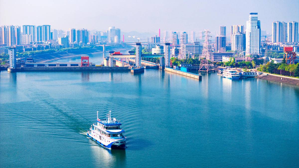 长江第一艘氢燃料动力船“三峡氢舟1”号在宜昌市长江葛洲坝水域巡航。(视界网 王耿 摄)