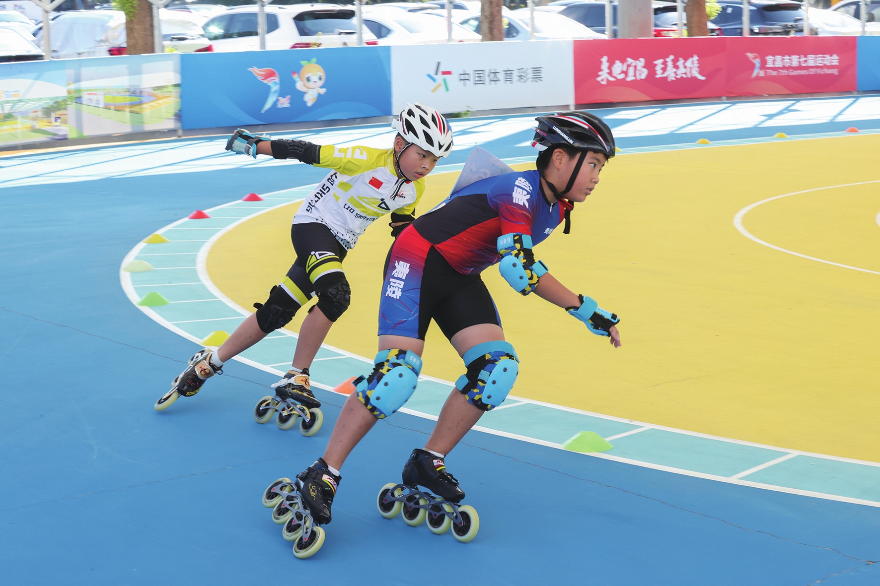 (青少年)轮滑比赛中,少年们脚踩轮滑鞋飞驰,身姿灵动,展现速度与活力。(记者周卓然 摄)