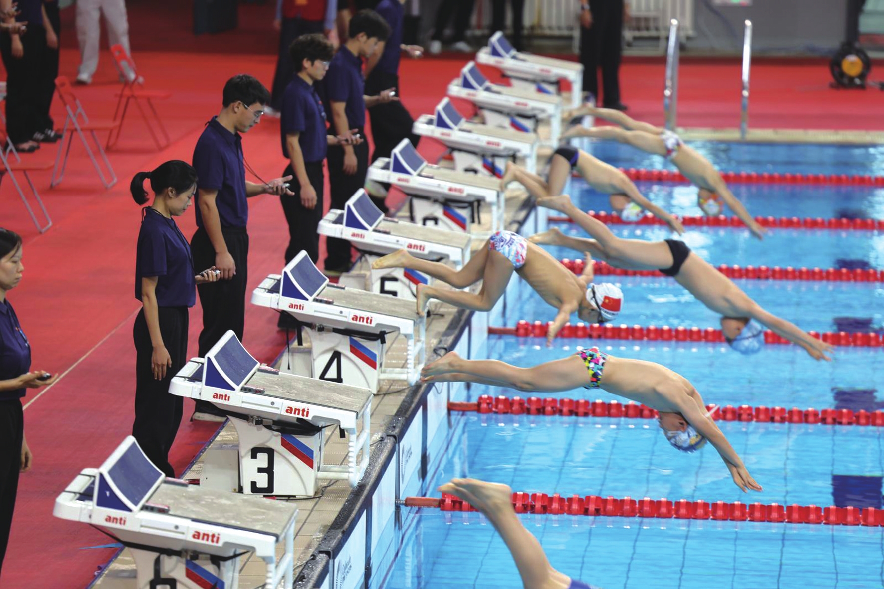 青少年运动员从跳台舒展身姿腾空跃起,以优美弧线跃入水中。(记者林潇 摄)