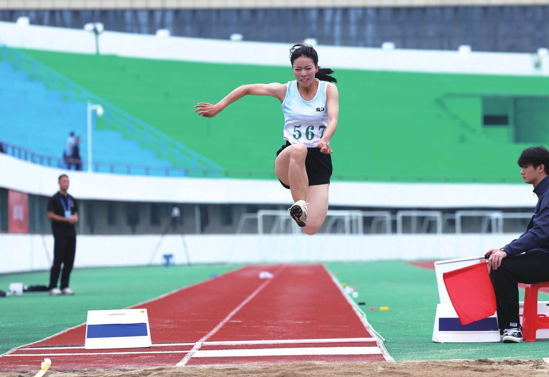 跳远比赛中,运动员腾空跃起,展臂发力,全力冲击更远距离。 (记者黄翔 摄)