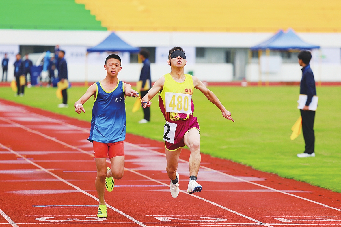 (残疾人)100米比赛现场,盲人选手奋力奔跑,用坚持诠释体育精神。 (记者黄翔 摄)