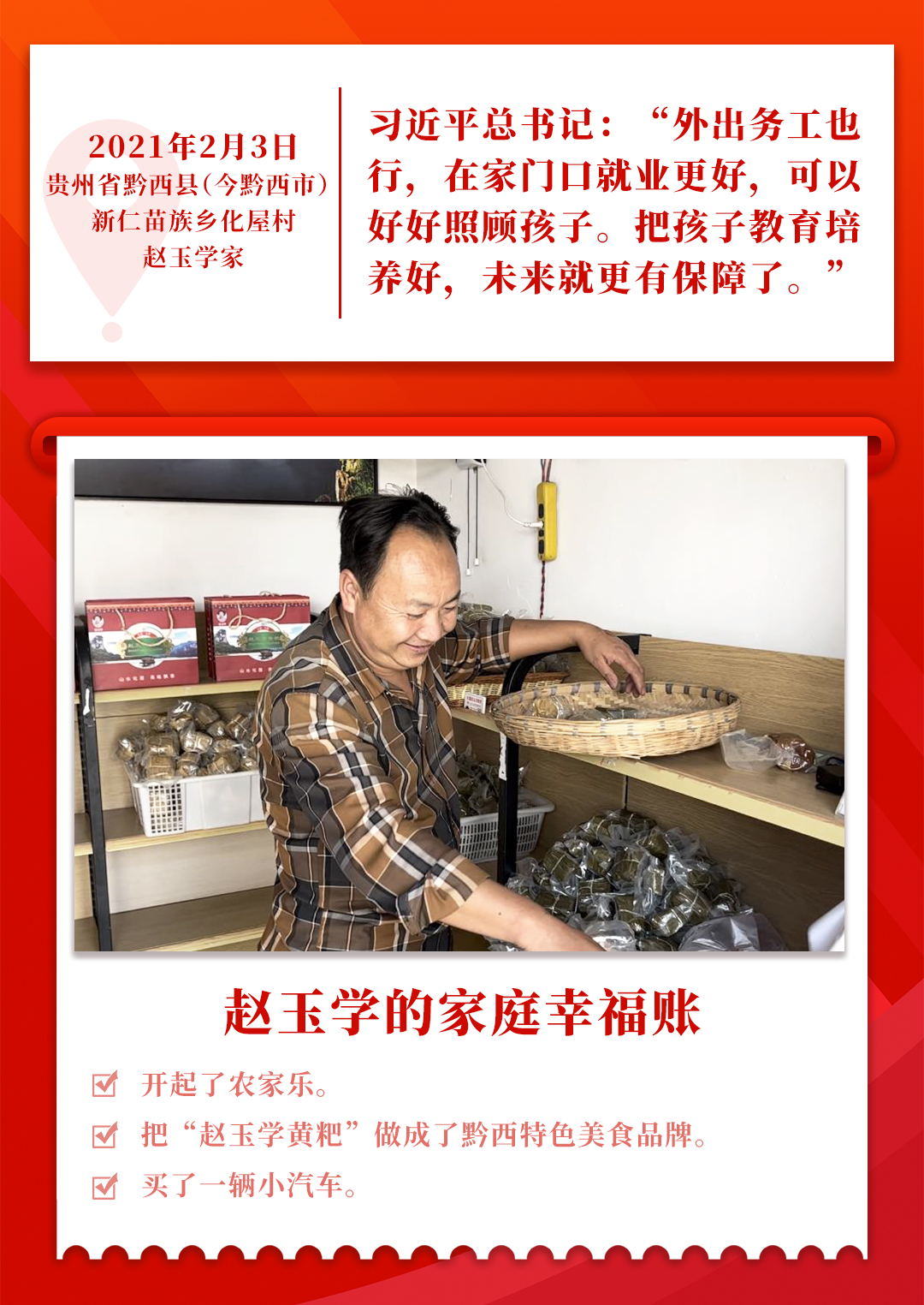 当年2月3日,农历牛年春节前夕,习近平总书记来到毕节市黔西市(原黔西县)新仁苗族乡化屋村苗族村民赵玉学家中,专程去看看乡亲们脱贫后的实际情况。