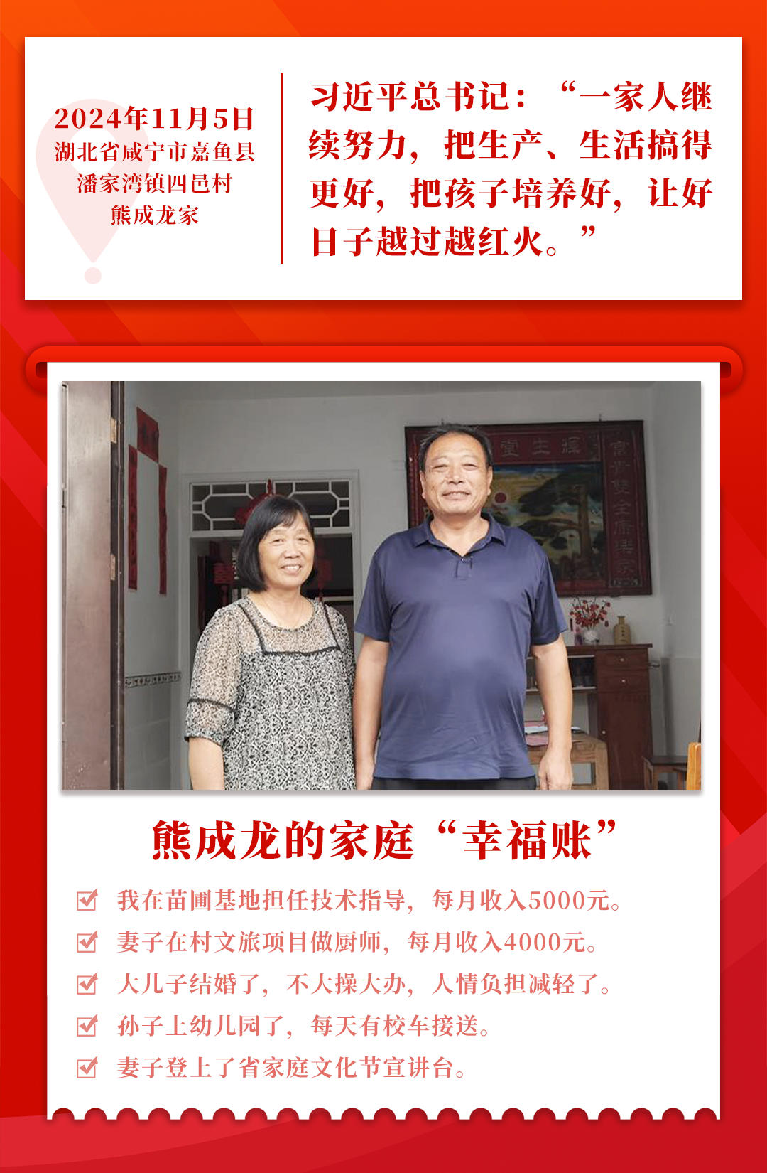 去年11月5日,在湖北省咸宁市嘉鱼县潘家湾镇四邑村村民熊成龙家,总书记从幼儿托育到医疗养老、务工务农,事无巨细地关心。