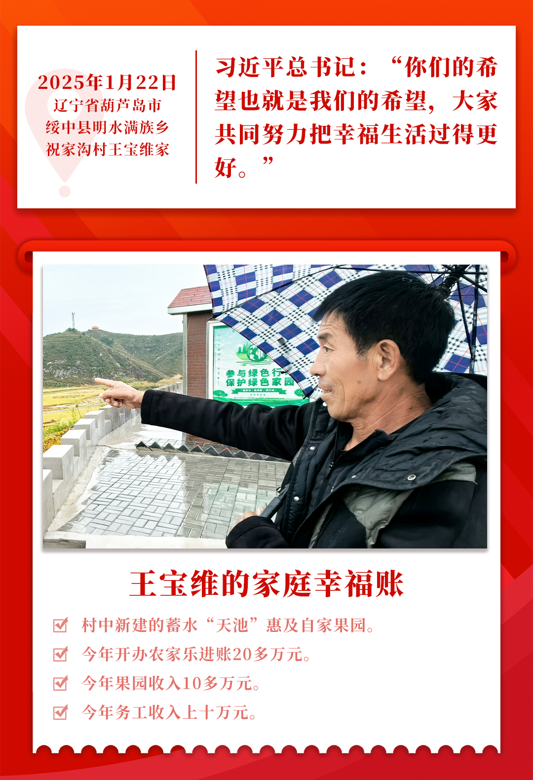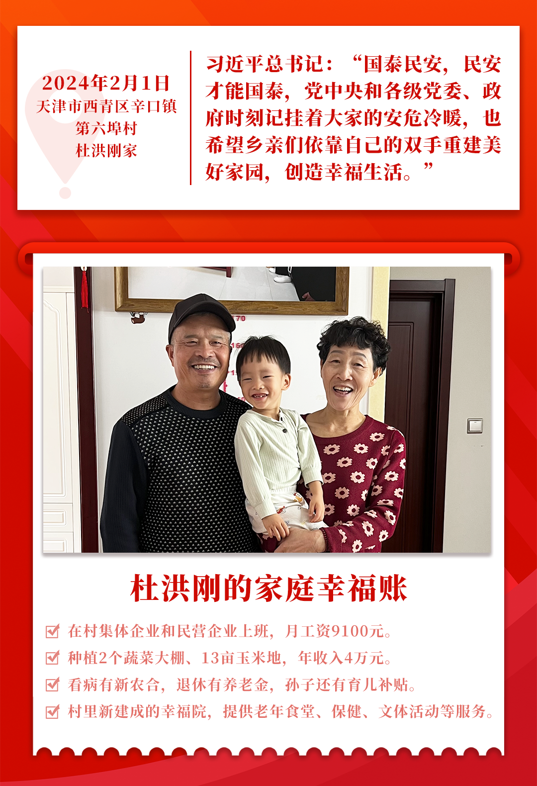 “临别时,总书记跟乡亲们说‘国泰民安,民安才能国泰’,这话我一直记到现在。”如今,杜洪刚的账本上,清晰写着:今年全家总收入能有23万多元,比去年增长了3万多元。