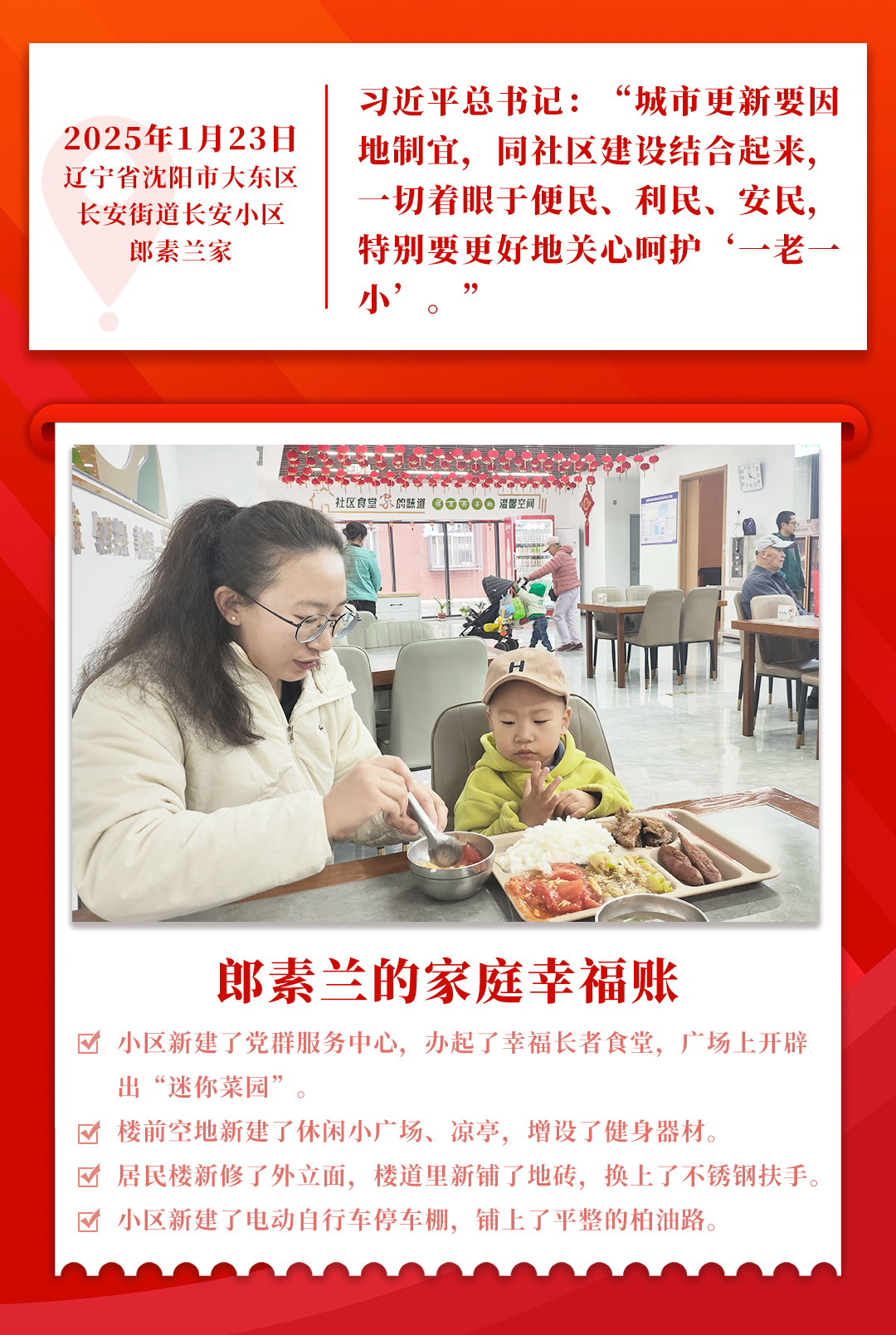 废弃锅炉房改造成居民活动空间、居民楼单元门上新装了智能锁、幸福长者食堂让吃饭更加便捷……郎素兰的外孙女孙佳宝说,社区党员干部群众都牢记总书记的殷殷嘱托,共同创建美好家园。
