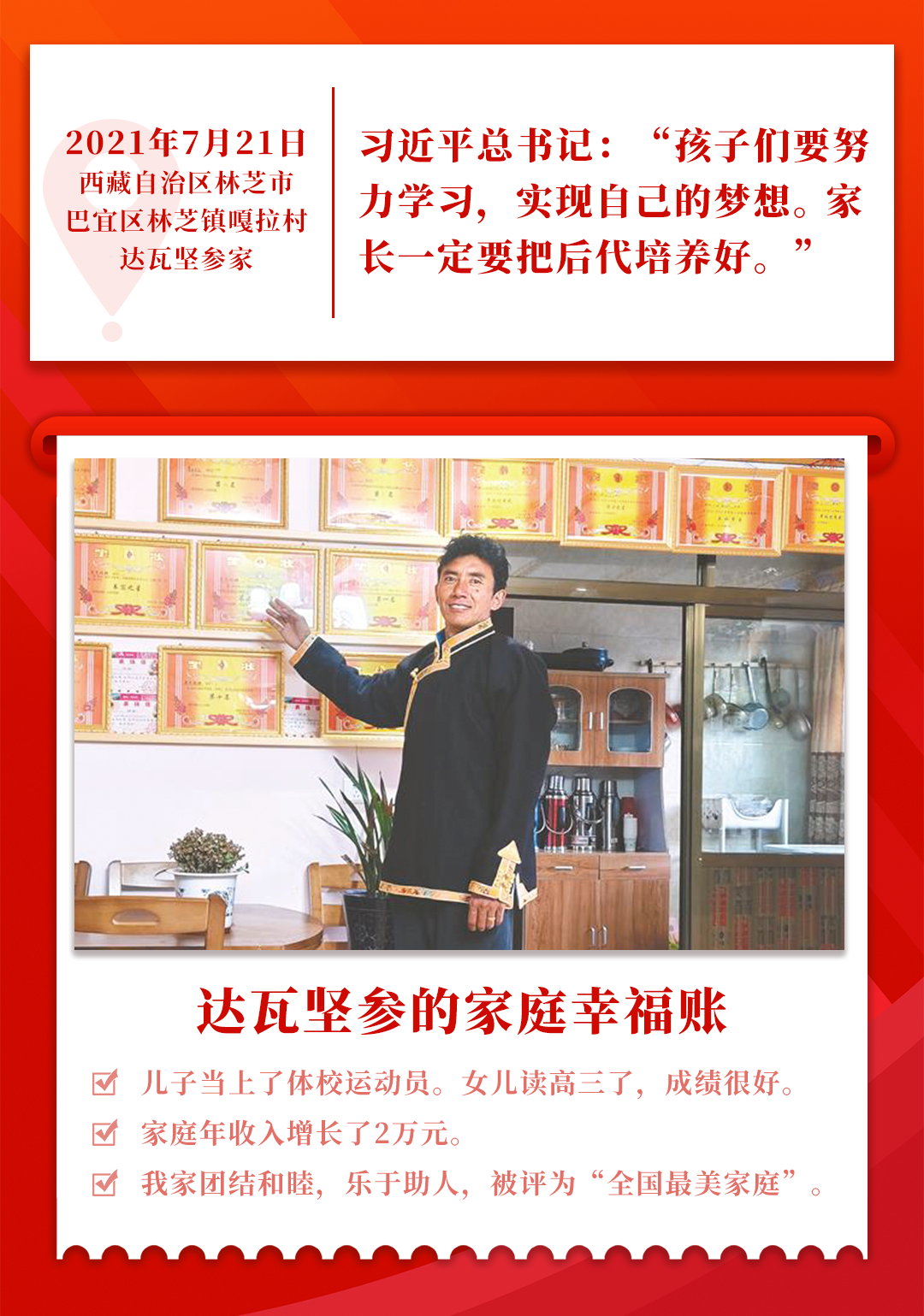 “要努力学习,实现自己的梦想。”这是2021年7月21日总书记在西藏林芝市巴宜区林芝镇嘎拉村村民达瓦坚参家做客时对他家两个孩子的叮嘱。