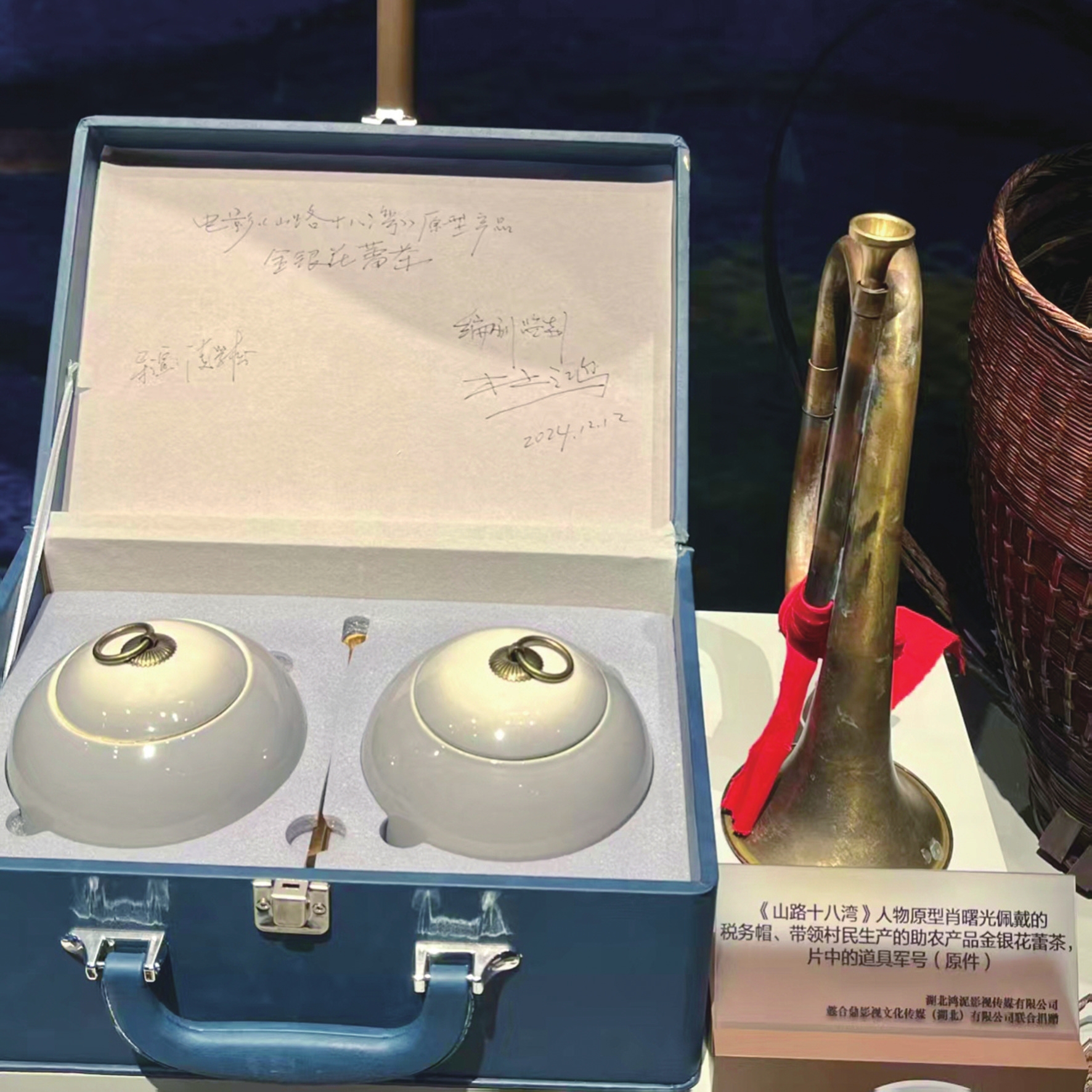 此次入展的实物承载着真实的扶贫记忆,其中包括片中象征红色精神传承的道具军号(原件),以及由原型人物肖曙光带领村民发展的助农产品金银花蕾茶。