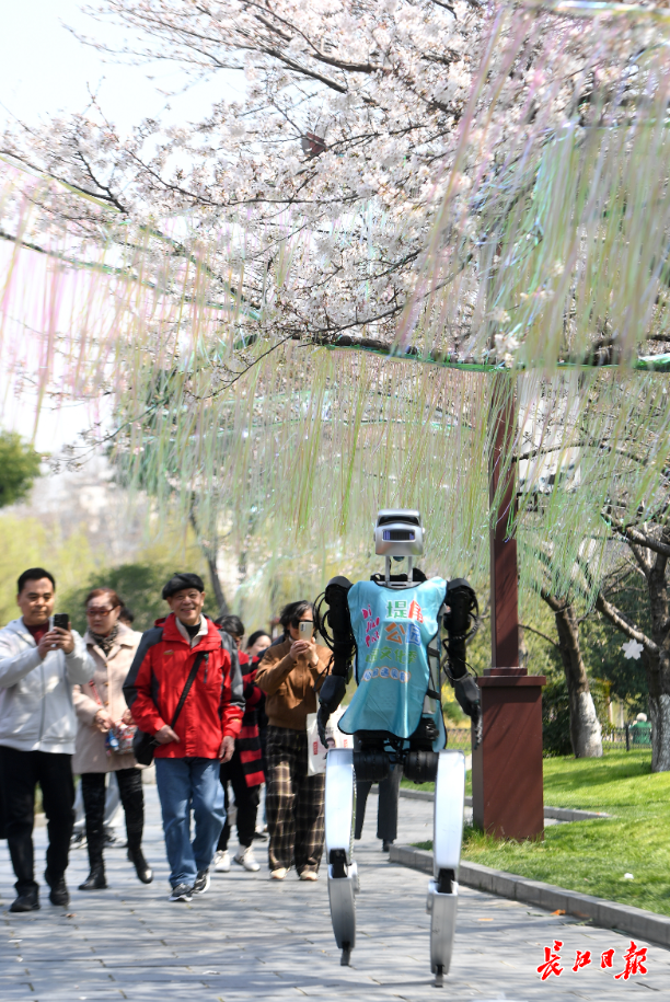 机器人H1-ReS独自行走在樱花树下,科技与浪漫碰撞出别样的意境。