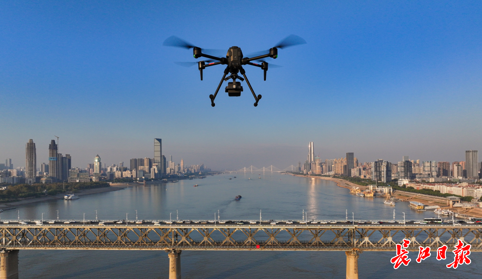 普宙科技无人机在武汉长江大桥上空往上、下游方向进行测绘、巡检。长江日报记者胡冬冬摄