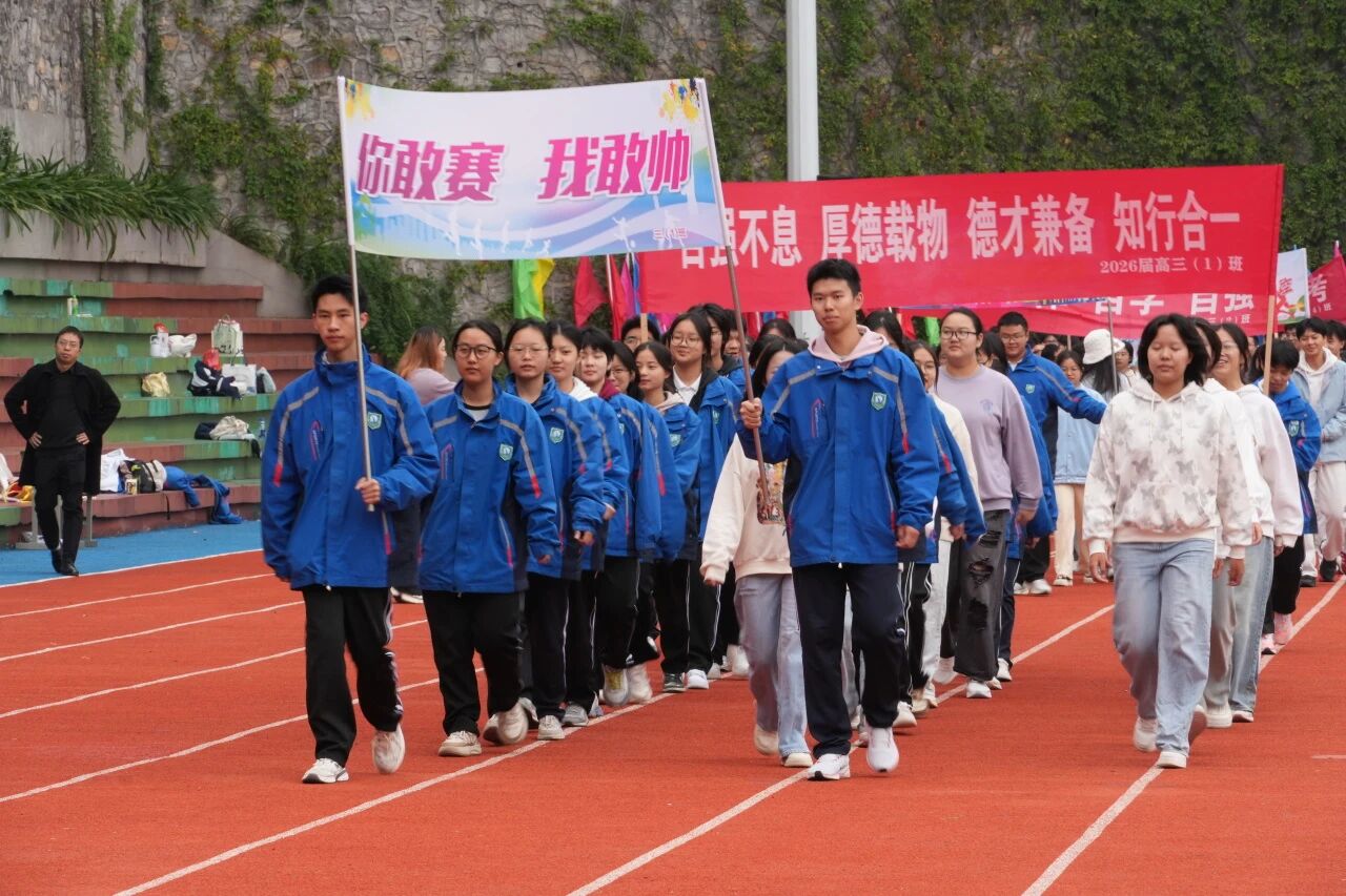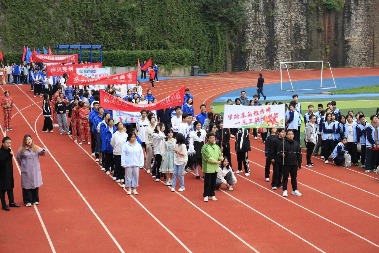 高三(1)班以青春之名加冕,奔赴运动之约。高三(2)班代表队怀揣必胜信念,誓言诠释体育精神。高三(3)班目光如淬火利箭,出鞘即胜似寒霜。高三(4)班誓将自强刻进步伐,用热血点燃赛场。高三(5)班携“小城夏天”的清风,步入赛场。高三(6)班健儿似惊雷破空,斗志昂扬。高三(7)班将以汗水编织胜利荣光。高三(8)班勇士正用行动诠释“青春无悔”。高三(9)班挟鹏程万里之势,尽显龙腾虎跃之姿。高三(10)班展露鹰击长空、鱼翔浅底的豪迈。高三(11)班口号嘹亮,震响青春誓言。高三(12)班以整齐动作谱写青春韵律,用灿烂笑容点燃运动激情。高三(13)班灵动变幻队形,以矫健身躯拼出2025,宣告一个崭新时代的降临。高三(14)班褪去课堂沉静,眉宇间尽显志在必得 。