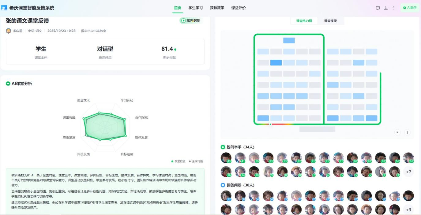 10月23日上午10时28分,张应霜老师的《彩虹》课在录播室开讲。40分钟的课堂上,AI系统通过无感知采集技术,实时捕捉师生互动的每一个细节——从教师3.3字/秒的语速,到34名学生的举手频率;从14分53秒的师生问答时长,到75%的平均抬头率,数据被同步记录、智能分析。课后生成的反馈报告,如同一份精准的“教学体检单”,清晰呈现课堂全貌。
