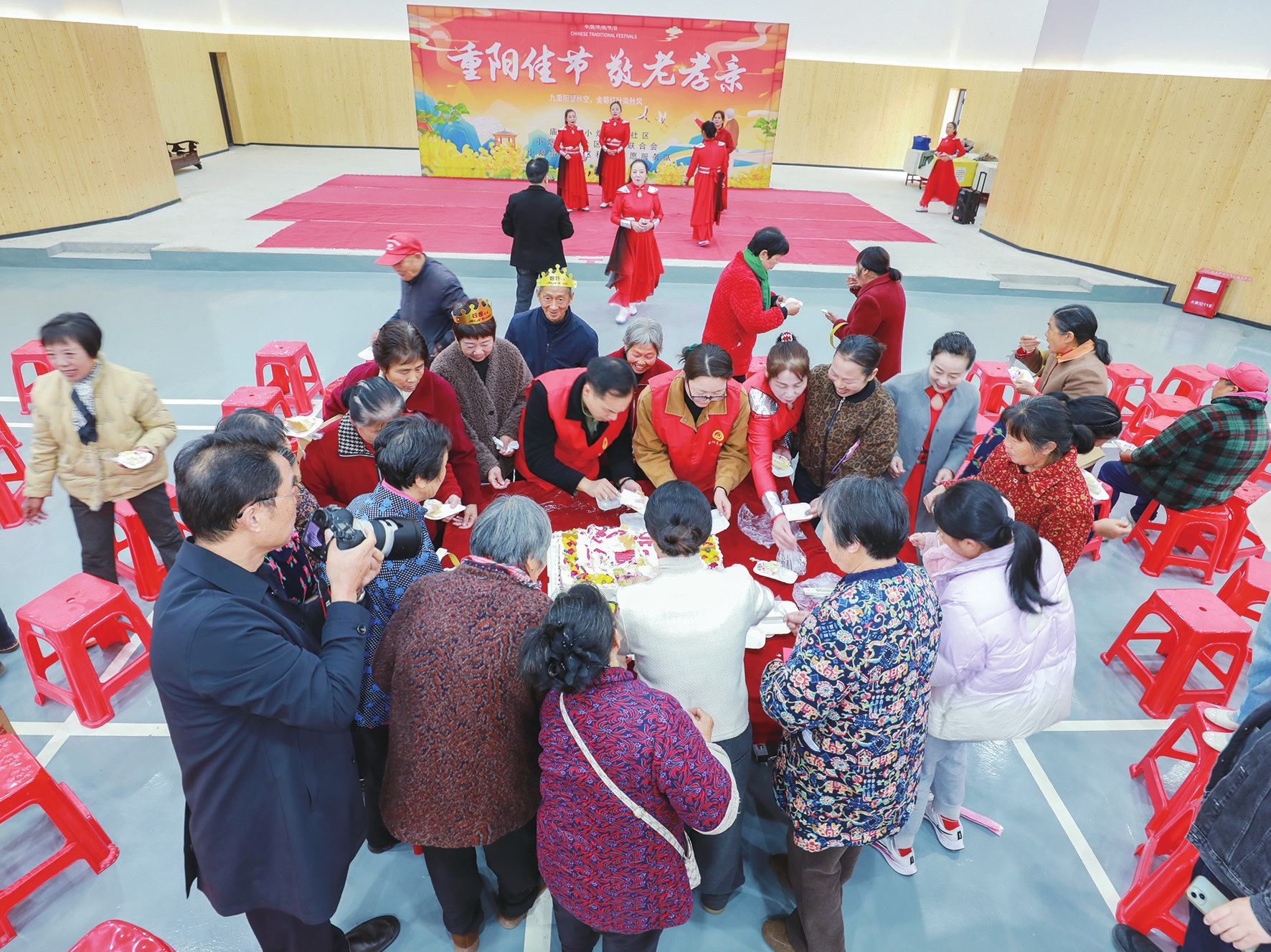10月28日,在当阳市新时代文明实践中心、庙前镇新时代文明实践所联合小烟墩集社区共同举办的“重阳佳节 敬老孝亲”活动现场,150多位老人欢聚一堂,共度重阳。大家学拍照,现场测量血压、血糖,咨询养生知识。志愿者还推出精美的节日蛋糕,分给每一位老人,全场齐唱祝福歌。(记者张锴、通讯员刘在洪 摄)