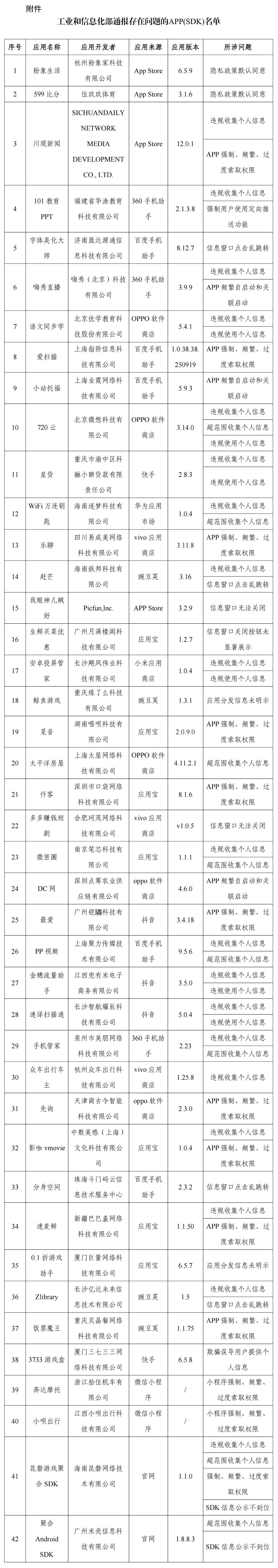 附件:工业和信息化部通报存在问题的APP(SDK)名单