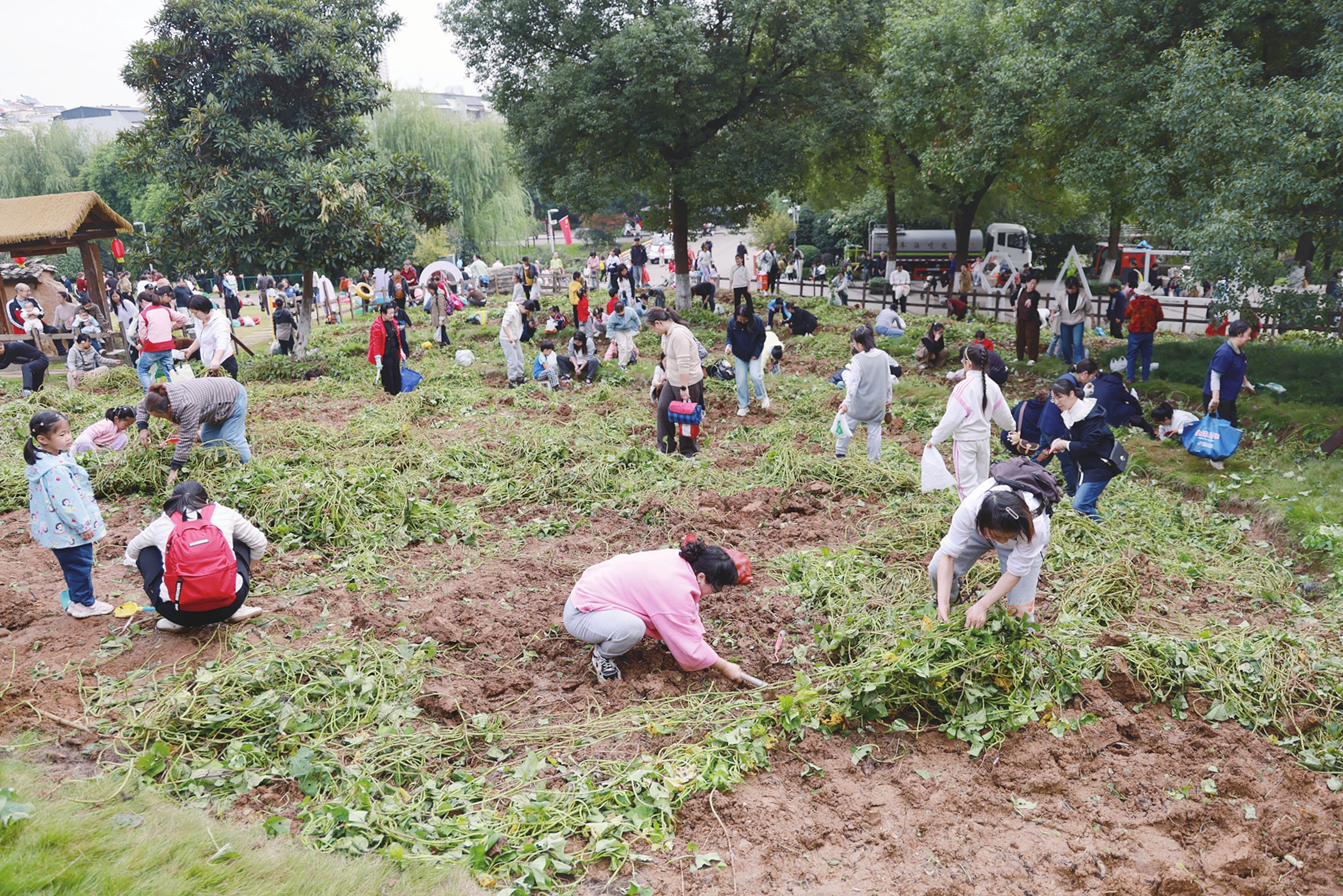 11月1日,宜昌城区运河公园慢漫园举办“一日农夫” 活动,吸引许多市民带着孩子来到这里体验劳动的不易与丰收的喜悦。图为市民在挖红薯。(记者黄翔 摄)