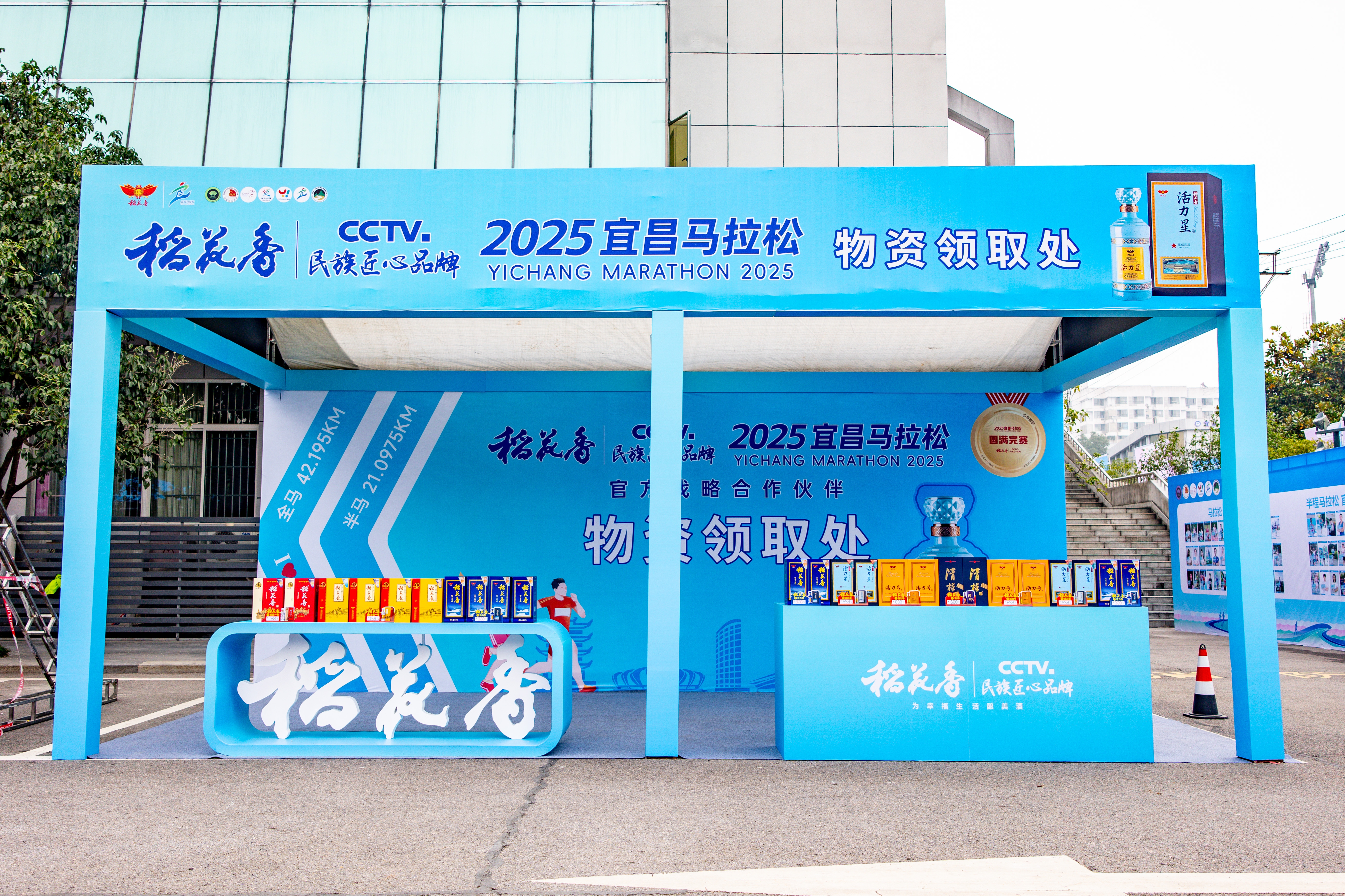 作为赛事多年战略合作伙伴,稻花香今年继续以创新方式助力“宜马”。比赛前,在宜昌市体育馆精心布置了物资领取处,为参赛选手提供贴心服务;赛道沿线,稻花香品牌道旗迎风招展,与秋日江景相映成趣;醒目的品牌展板点缀在赛道两侧,成为选手们奔跑路上的一道亮丽风景。终点区域特别设置的稻花香互动体验区,不仅展示了稻花香核心产品,还提供完赛纪念品、合影留念区及号码牌塑封服务,为选手们珍藏这份独特的参赛记忆。