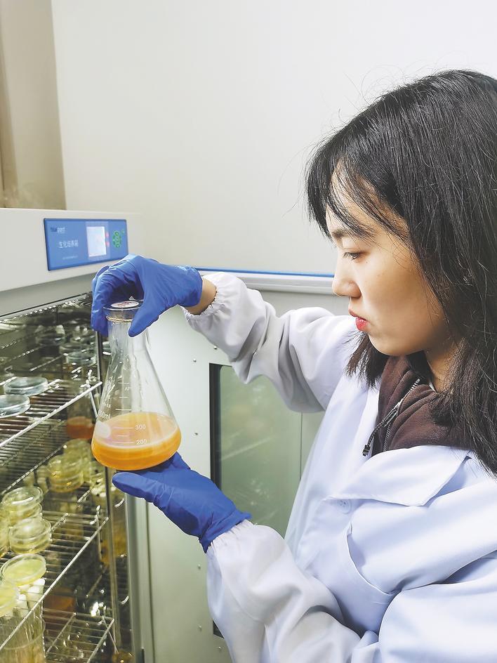 武汉纺织大学研究人员高冲查看菌种“面料”生长情况。(记者包东喜摄)