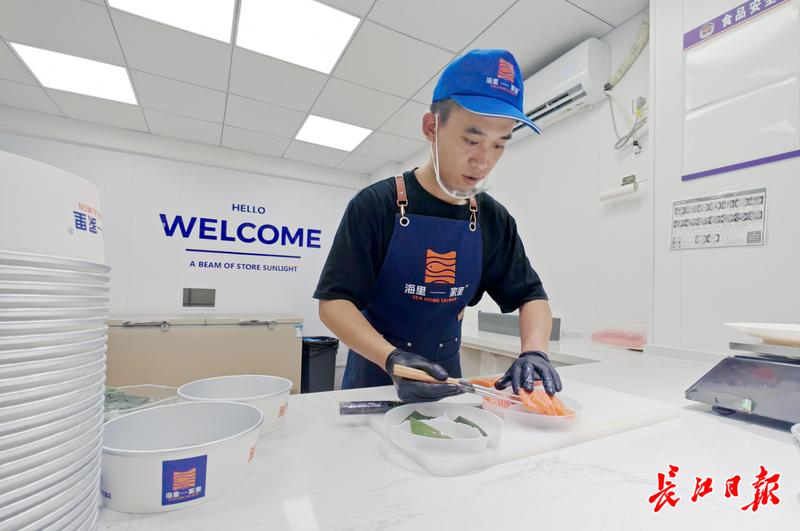 海里家里鄂州店店员在将切好的三文鱼装盘。记者史伟 摄