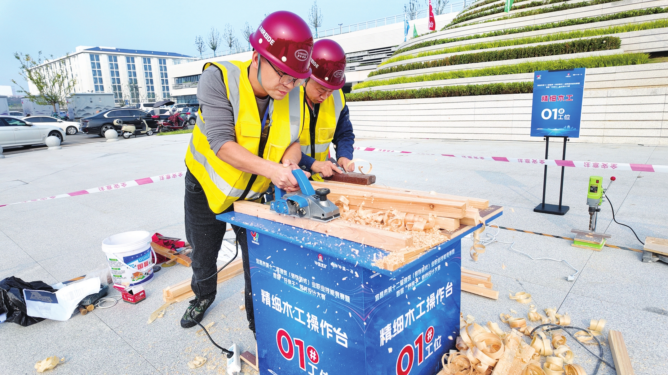 铺装区内,选手们搅拌、放线、校正,动作一气呵成;镶贴区内,选手们挑砖、测量、切割,行云流水见真功;木工区内,锯木声、凿击声、刨刀声,交织成悦耳的交响乐;测绘区内,观测员、测量员、记录员分工明确,力求精准到毫厘……