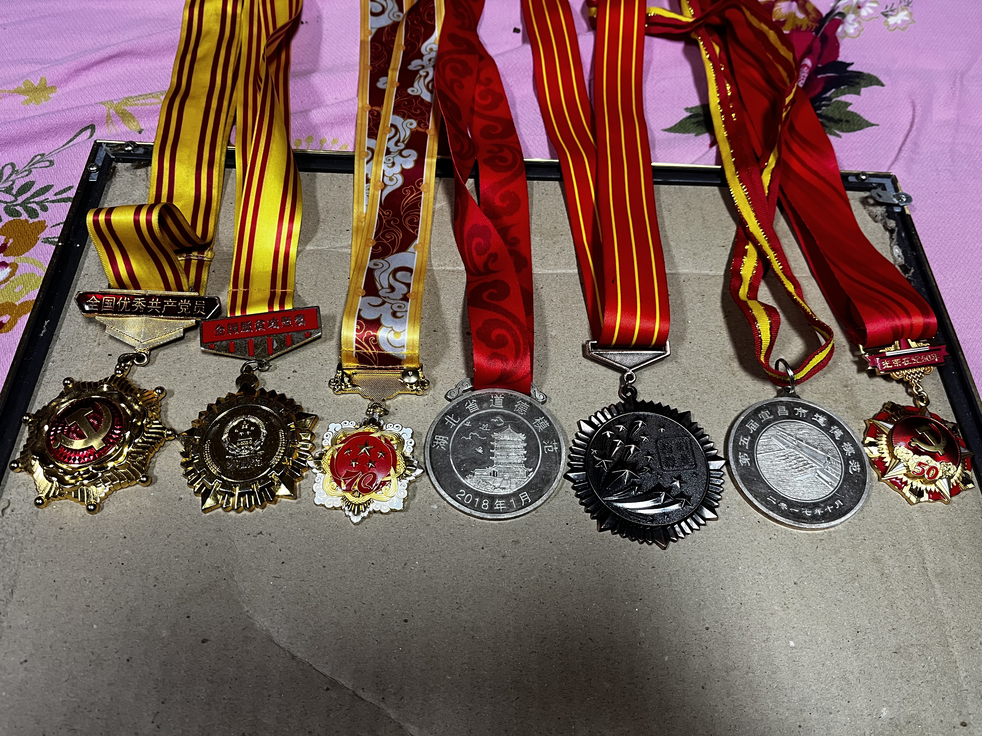 在罗官章的衣柜里,最上层有一个小包裹,里面是7枚奖章:庆祝中华人民共和国成立七十周年纪念章、光荣在党五十年纪念章及全国优秀共产党员、全国道德模范提名奖、湖北省道德模范、荆楚楷模、宜昌市道德模范等荣誉奖章。