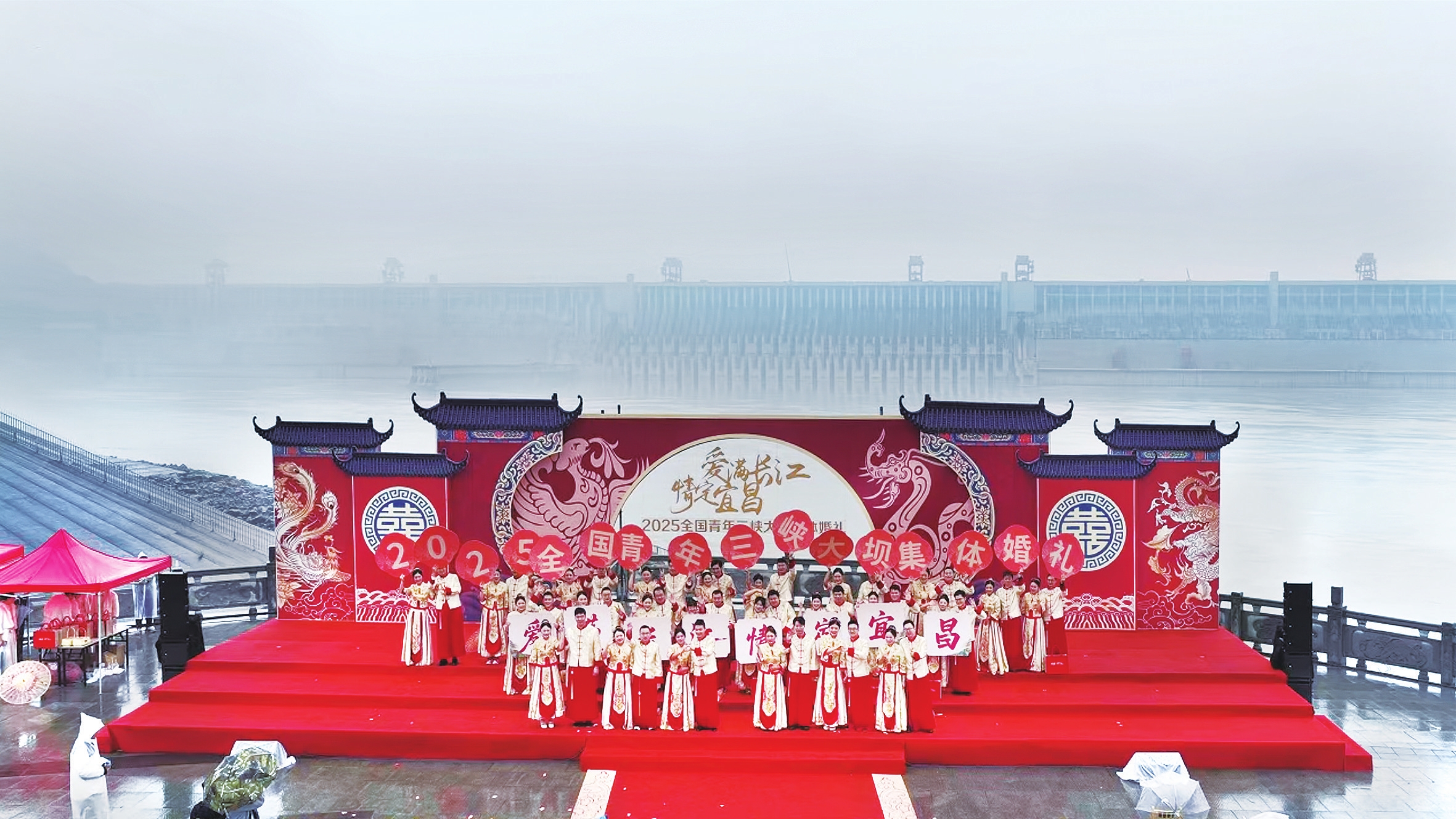 11月6日,三峡大坝截流纪念园内洋溢着喜庆氛围,“爱满长江 情定宜昌”2025全国青年三峡大坝集体婚礼在此举行。24对来自全国各地、各行业的新人齐聚大坝之畔,以集体婚礼的形式举行中华传统婚典,开启幸福新篇章。(团市委供图)