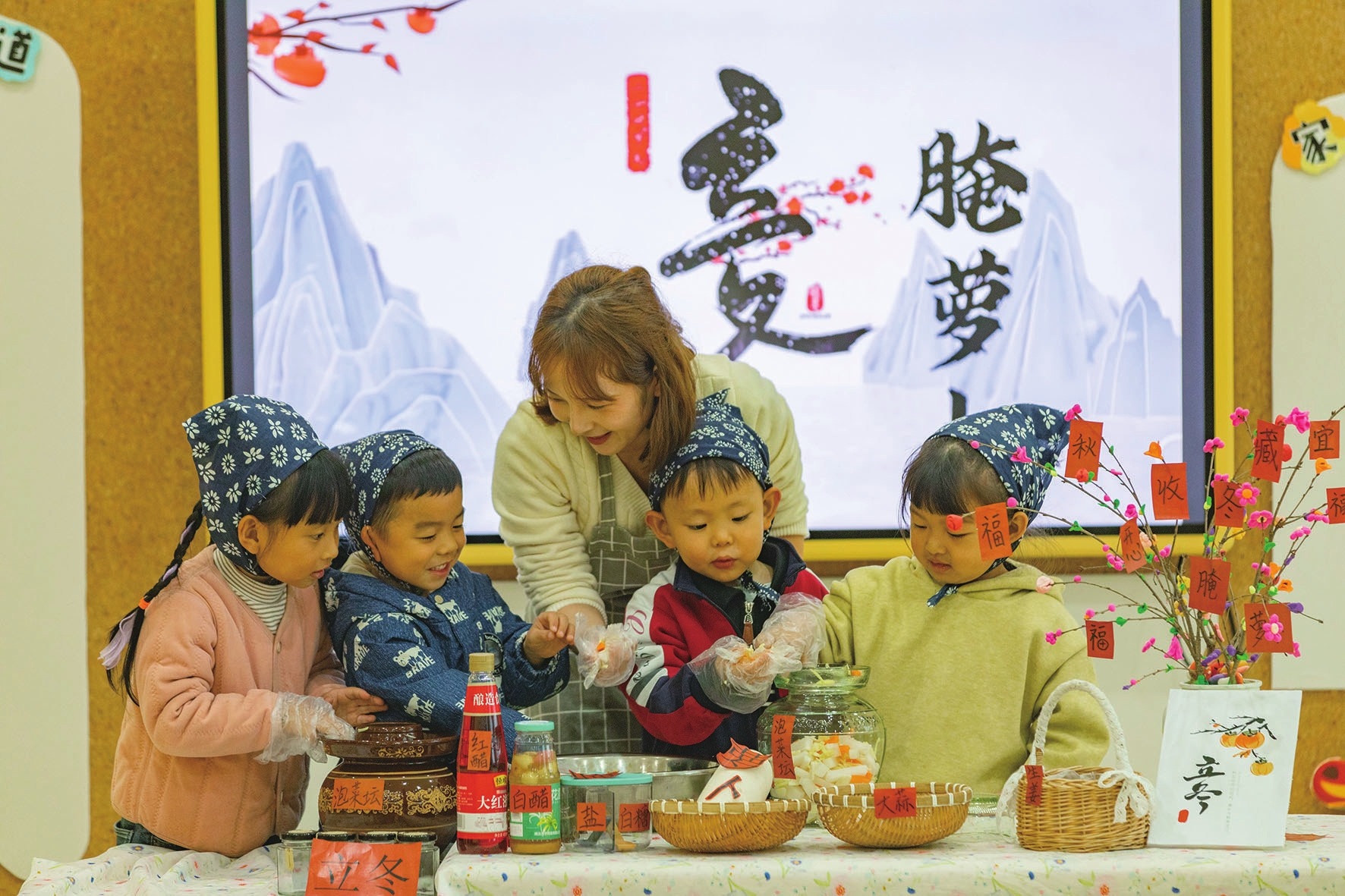11月6日,秭归县屈子天问幼儿园开展了一场以“迎立冬·传民俗”为主题的节气实践活动。孩子们在老师的带领下亲手制作橘子罐头、腌制爽口泡菜、包制手工饺子,在动手体验中了解立冬节气的文化内涵,感受传统文化的魅力。(通讯员彭强 摄)
