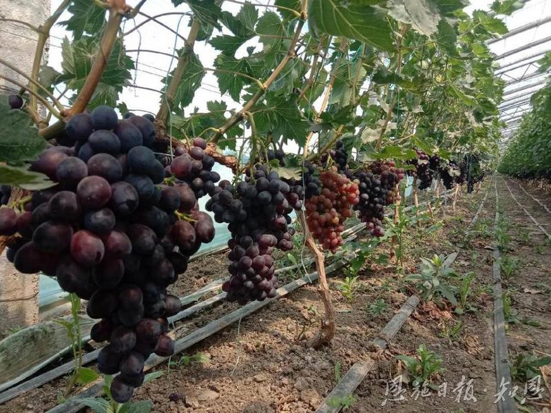 “阳光玫瑰”纯甜无酸,“夏黑”皮薄爆汁,“蓝宝石”脆甜无渣,“深红”无籽清新爽口,“藤稔”颗粒饱满……5个品种的葡萄,从7月到10月错峰梯次成熟,延长市场供应期,提高土地利用效率和产出效益。由于葡萄园临近曜天眼景区,今年吸引了许多游客前来采摘打卡。
