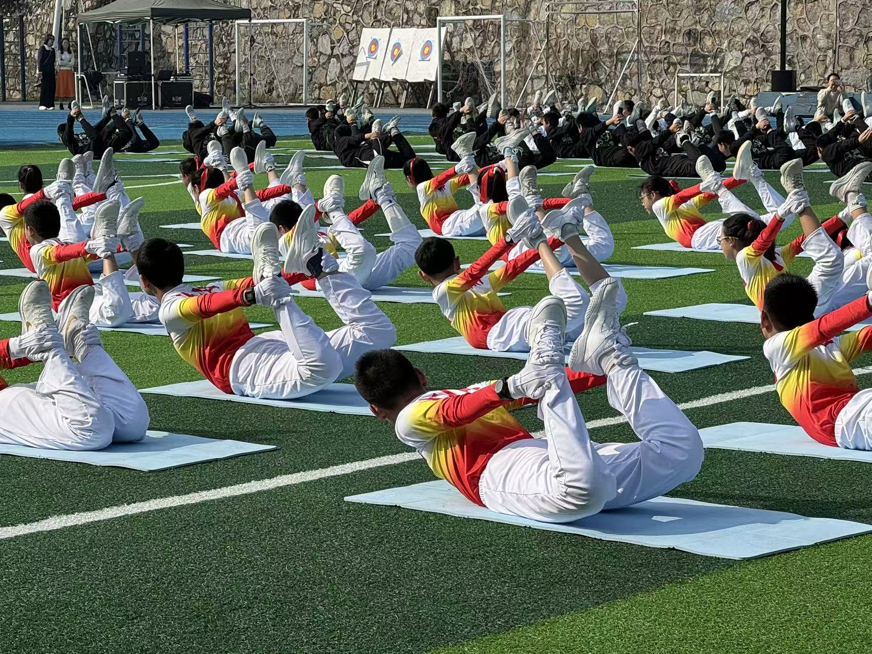 开幕式高光时刻,青春风采惊艳全场。伴随着激昂的《运动员进行曲》,国旗队、彩旗队、鲜花队迈着铿锵步伐率先入场,整齐的队列、坚定的眼神,彰显着少年意气。各年级班级方阵依次亮相,创意班服亮眼吸睛,嘹亮口号响彻云霄。七年级学子以整齐划一的素质操展现新生风采,动作舒展有力,尽显少年朝气;八、九年级学子则带来武术操、花样跳绳等特色表演,将传统体育与创意元素巧妙融合,一招一式尽显功底,赢得全场阵阵掌声。