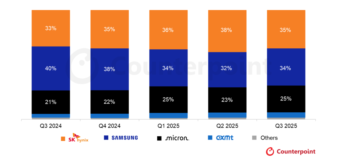 ▼2024年Q3至2025年Q3 DRAM市场份额分布。信源:Counterpoint Research Memory Tracker