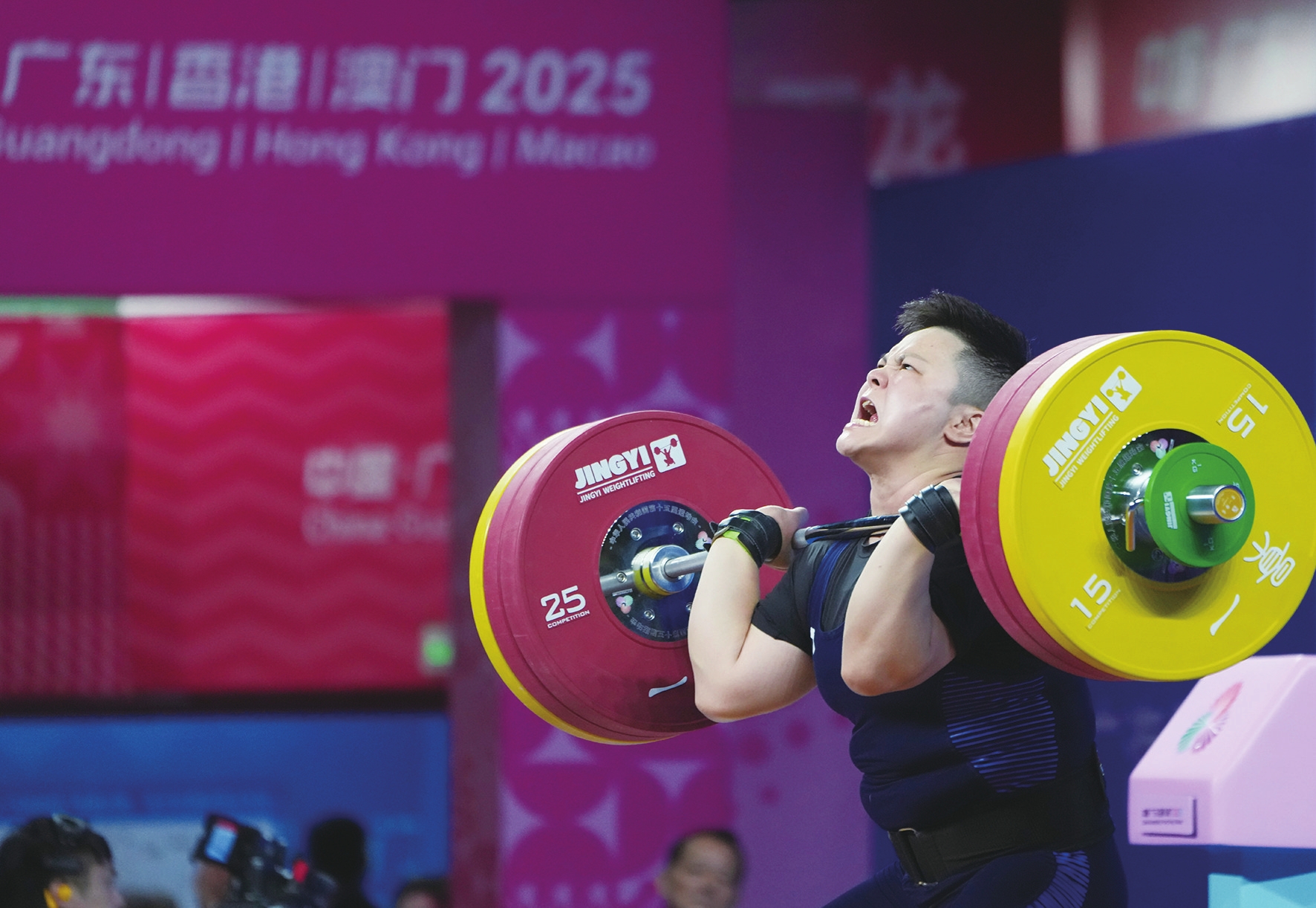 11月14日,湖北队选手汪周雨在挺举比赛中。最终,她夺得冠军。 当日,第十五届全国运动会举重女子87公斤级决赛在东莞举行。 (新华社记者 杨晨光 摄)