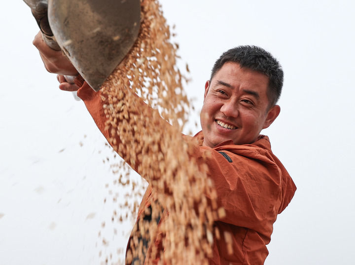 2025年5月27日,江苏省淮安市盱眙县种粮大户刘凯在田间查看收获的小麦。这批小麦选用淮安市农科院选育的良种“淮麦60”。新华社发(许昌银摄)