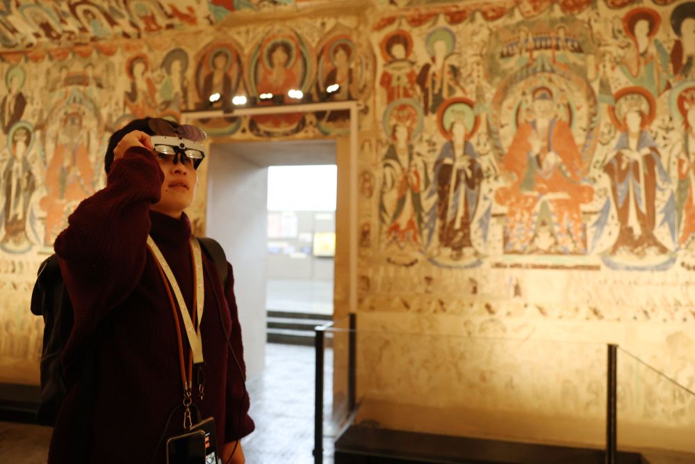 2024年7月22日,一名游客在敦煌莫高窟“寻境敦煌——数字敦煌沉浸展”上借助VR设备沉浸式游览莫高窟第285窟虚拟场景。“寻境敦煌”综合运用了VR虚拟现实、三维建模、游戏引擎的物理渲染和全局动态光照等新技术,高精度立体还原了莫高窟第285窟。游客戴上VR眼镜,不仅可以零距离观赏壁画、360度自由探索洞窟细节,还能“飞升”到窟顶,身临其境参与壁画故事情节,沉浸式感受敦煌文化的魅力。