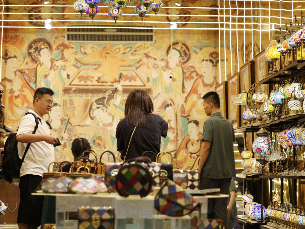 2025年6月26日,游客在敦煌夜市选购文创产品。今年以来,敦煌市全面改造敦煌夜市等特色街区,围绕敦煌深厚的历史文化底蕴,融入壁画、丝路文化等元素,通过布设文化景观小品、打造沉浸式餐饮体验空间、上线特色文创产品等方式,给游客带来多元体验,“夜经济”持续升温,不断释放文旅消费潜力。