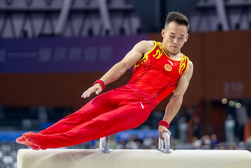 2024年7月29日,肖若腾在巴黎奥运会体操男子团体决赛鞍马比赛中。新华社记者 程敏 摄