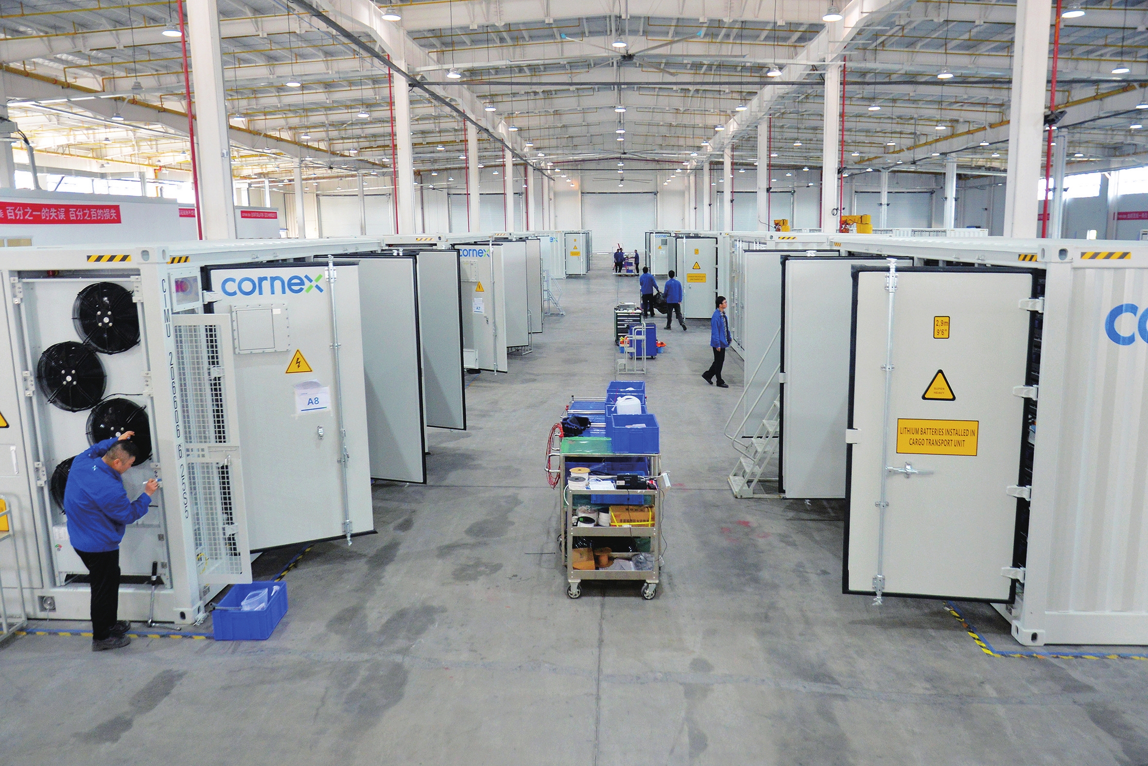 据介绍,这批集装箱电池预制舱是楚能新能源“314Ah电池+5MWh储能集装箱”的系统组合。一个储能电池预制舱,有近5000块电芯,每一个电池预制舱侧面,都有一个专配的电池“管家”。可视化屏幕上,实时监测电芯的电压、电流和温度,防止过充、过放、短路和过热等风险。(通讯员 张国荣 摄)