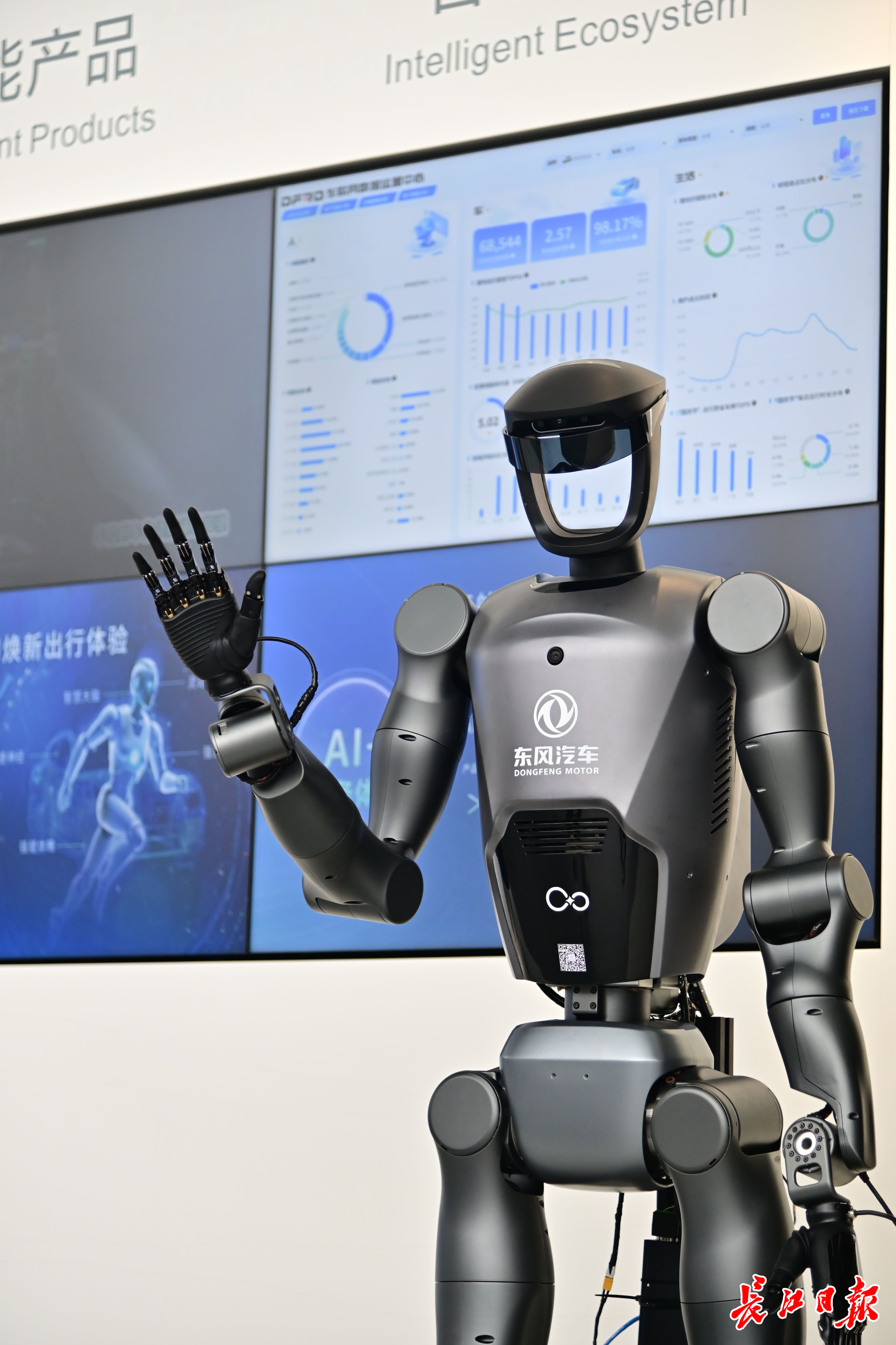“可以握个手吗?”11月14日,记者走进展厅,小东抬起手,机械掌指微微弯曲,稳稳伸过来。它能说能走,能进行语音交互,滔滔不绝地给记者介绍起东风汽车自研的太极大模型、天元架构,以及未来技术方向。