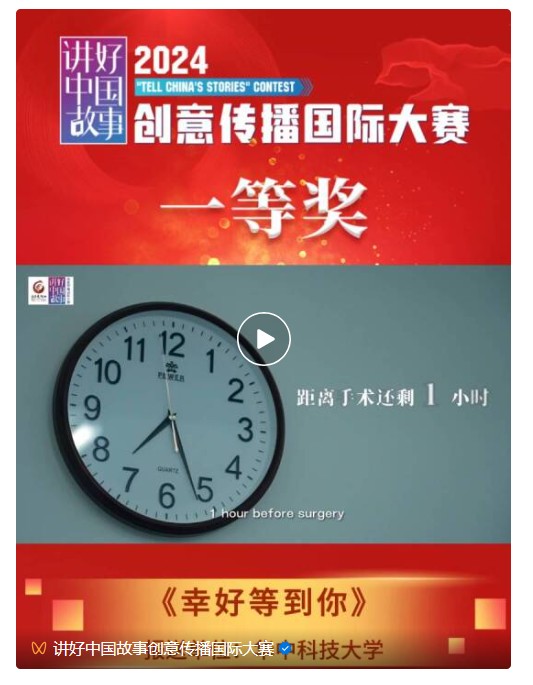 华中科技大学报送的《幸好等到你》也获得了全国大赛一等奖。作品聚焦一群医生合力托举一位残疾妇女的真实故事,以纪录片的形式,真实再现了医学与人文关怀的伟大力量。领奖代表、协和医院陈有为介绍,自“讲好中国故事”创意传播首届大赛开始,武汉协和医院就一直积极参与,多次获奖。“我们将继续秉持医学的创新精神,用镜头记录真实,用故事传递人间温暖,努力创作出更多展现中国精神、中国力量、中国担当的优秀作品,为增进国际理解、推动文明交流互鉴贡献协和和华科大力量。”