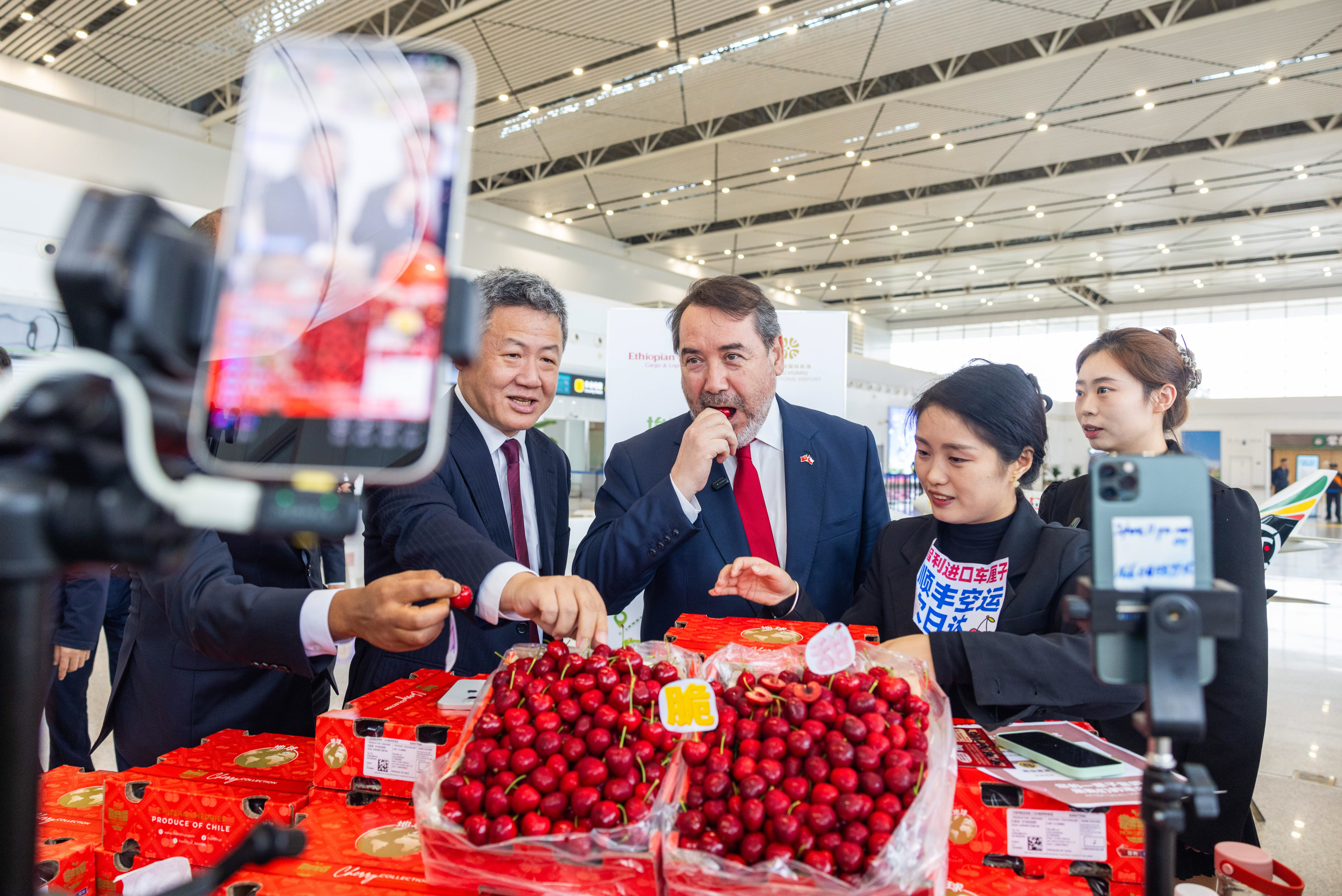 11月7日,智利驻华大使巴勃罗·阿里亚兰(右三)走进花湖国际机场车厘子直播间,向网友推介智利车厘子。