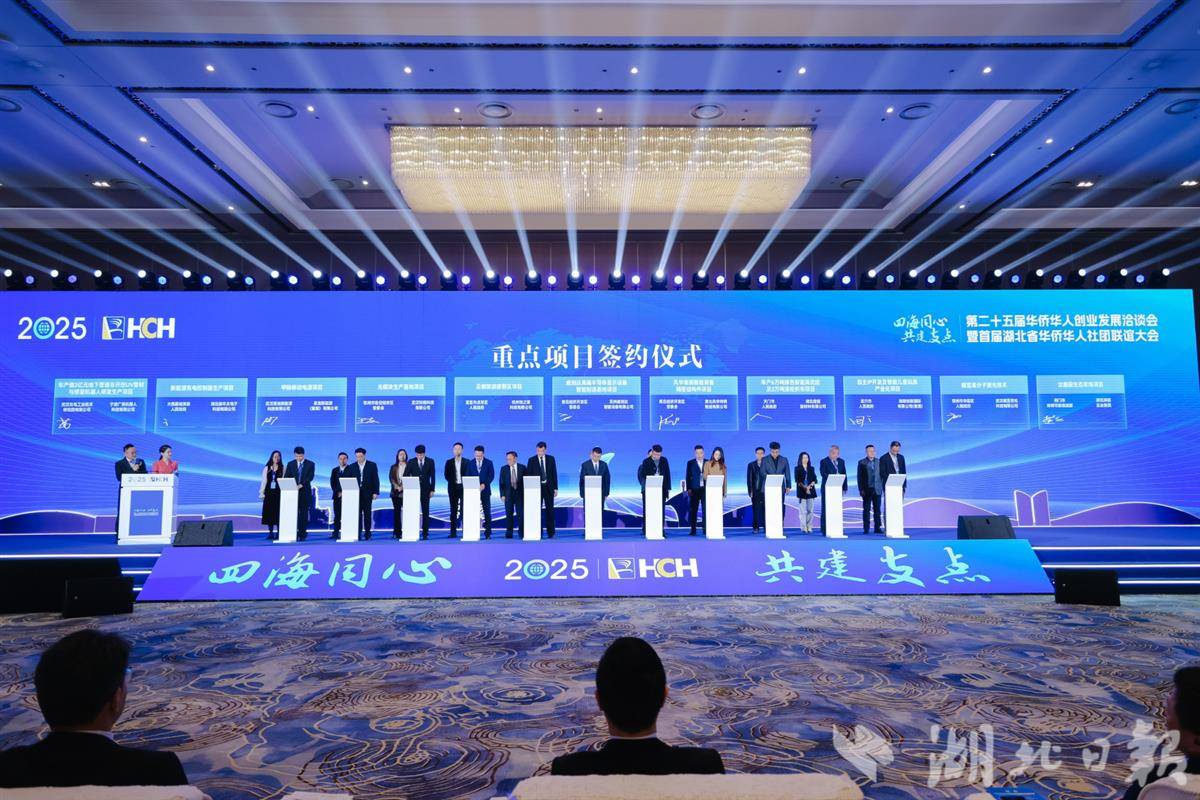 中国梦,荆楚情,支点潮。11月25日上午,第二十五届华侨华人创业发展洽谈会暨首届湖北省华侨华人社团联谊大会在武汉光谷科技会展中心开幕,来自全球50多个国家和地区的500余名嘉宾共赴“侨海之约”,现场签约82亿元,10个海外高层次人才项目落地,助力湖北加快建成支点。