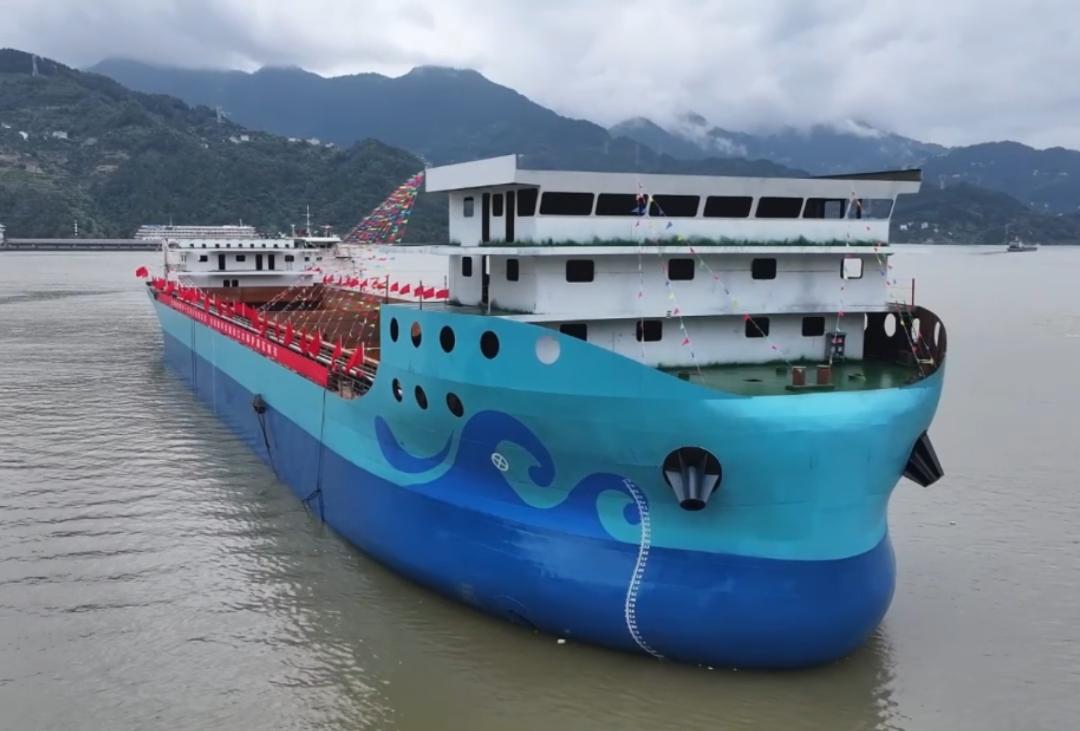 7月1日,由湖北东船重工有限公司建造的LNG(液化天然气)新能源船舶“景鹏1009”在枝江顺利下水启航。图片来源:枝江市七星台镇