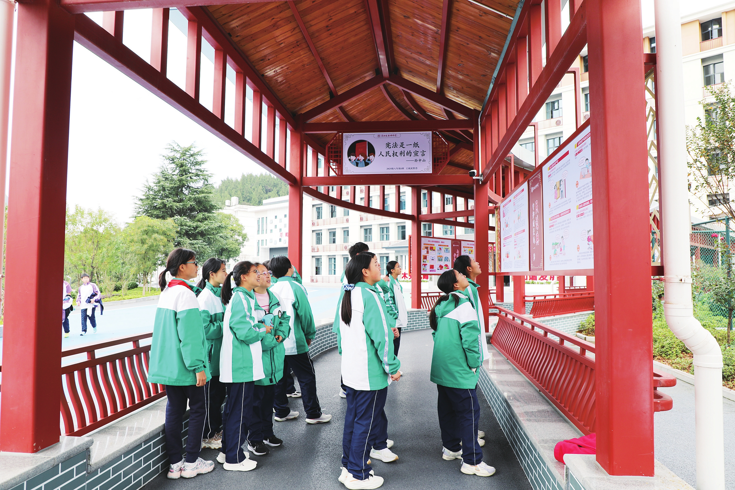近日,长阳土家族自治县司法局在辖区龙舟坪中学建成一处以民法典、未成年人保护法等为主题的法治文化长廊。该长廊作为提升未成年人法治意识的重要法治文化阵地,在保留原有中式建筑风貌与格局的基础上,深度融合法治元素,通过系统化、互动化的内容设计,使法治教育常态化、场景化融入校园环境中,营造出“随处可见、随时可学”的浓郁法治氛围。(通讯员秦素兰 摄)