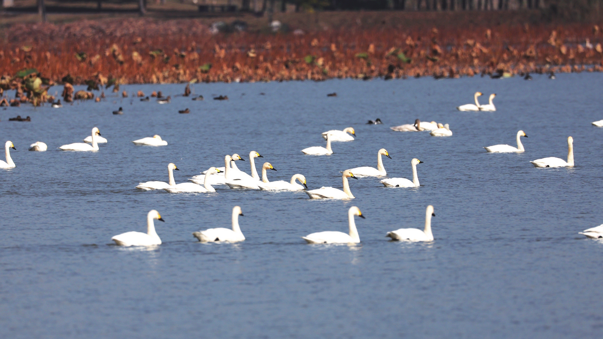 11月30日,当阳市草埠湖镇季家湖湿地,成群的小天鹅游弋觅食,洁白的身姿与清澈的湖水相映成趣,构成一幅动人的湿地生态画卷。(记者黄翔 摄)