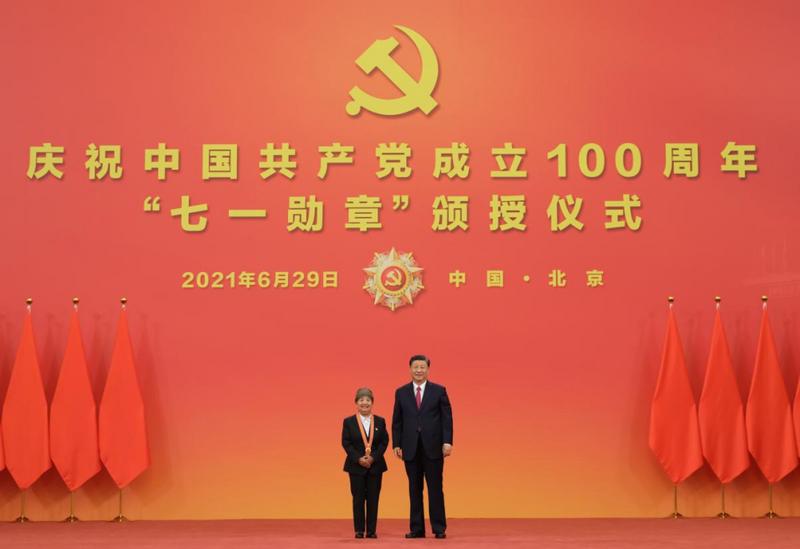 2021年6月29日,庆祝中国共产党成立100周年“七一勋章”颁授仪式在北京人民大会堂金色大厅隆重举行。中共中央总书记、国家主席、中央军委主席习近平向“七一勋章”获得者王兰花颁授勋章。新华社记者 李学仁 摄